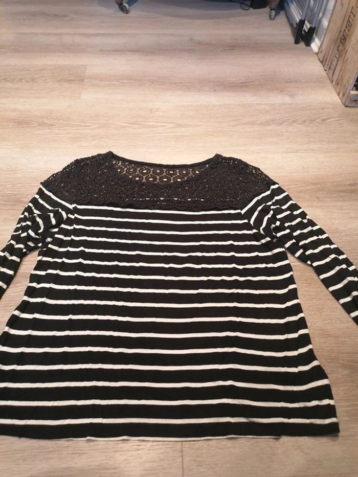 Bonjour, je vends ce tee shirt manches 3/4 rayé noir et blanc avec dentelle sur le haut en parfait état. Taille 46/48. Lavé maison non fumeur.
