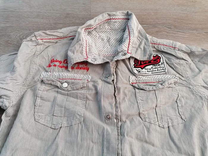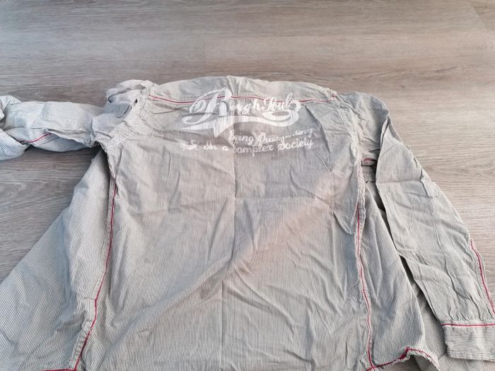 Bonjour, je vends cette chemise à manches longues rayées blanches et grises de la marque RG512 taille 12ans. En très bon état. Lavé maison non fumeur.