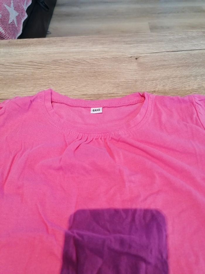 Bonjour, je vends ce tee shirt rose taille 6ans en très bon état. Lavé maison non fumeur.