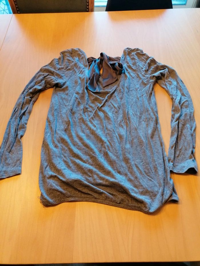 Bonjour, je vends ce tee shirt gris avec un nœuds dans le dos taille 1 de la marque Camaïeu. Très bon état. Lavé maison non fumeur.