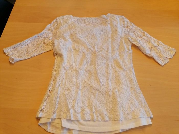 Bonjour, je vends ce tee shirt avec dentelle. Doublure sur le torse. Marque ici et maintenant. Taille 38/40. Très bon état.