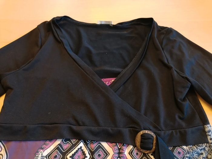 Bonjour, je vends ce tee shirt manches 3/4. Cache cœur sur la poitrine. Noir en haut et motifs violet en bas. Très bon état. Marque in extenso. Taille M.