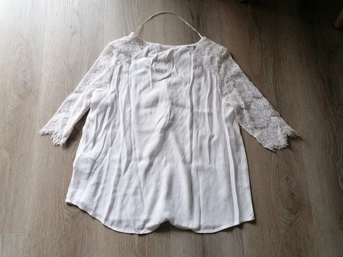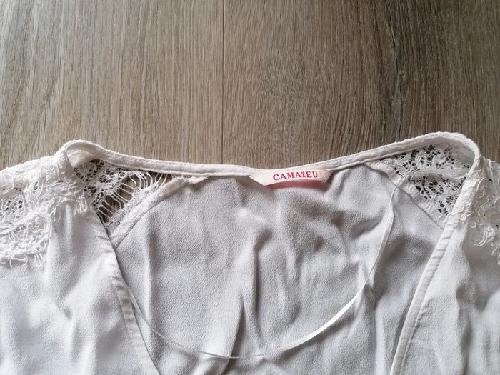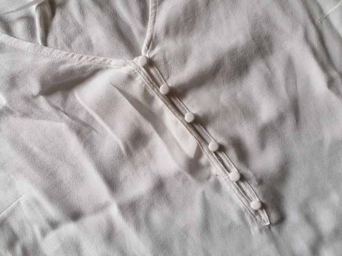 Bonjour, je vends ce tee shirt manches 3/4 blanc. Petit décolleté avec boutons entre la poitrine. Très bon état. Marque camaïeu, taille 44.