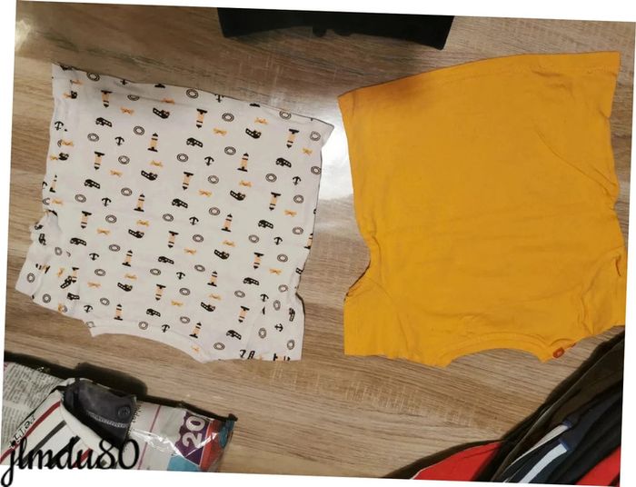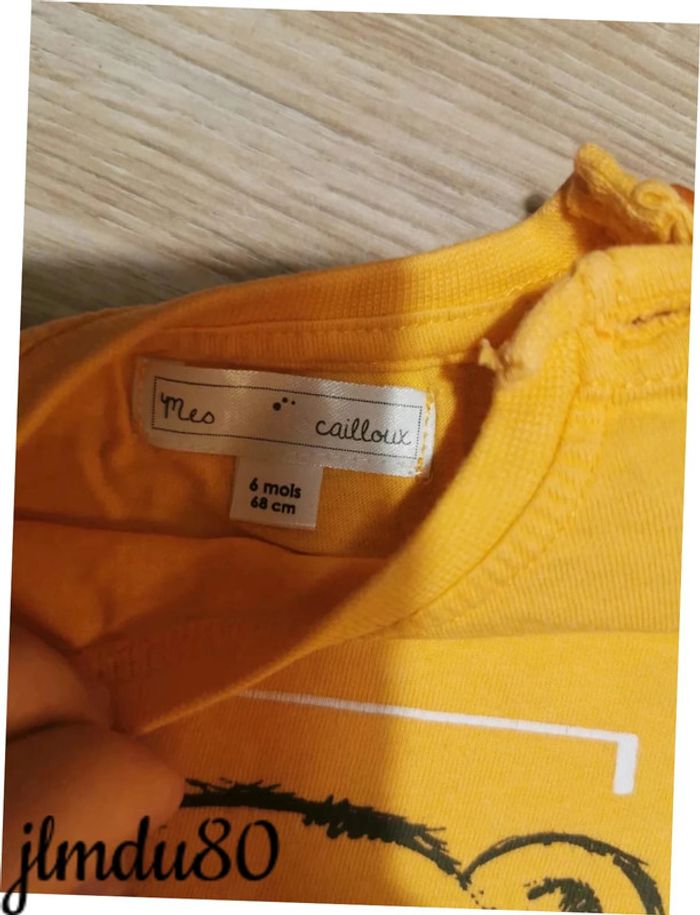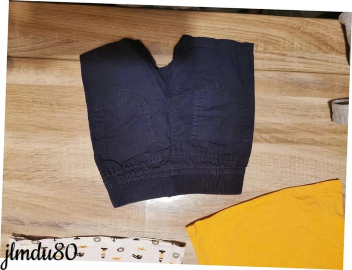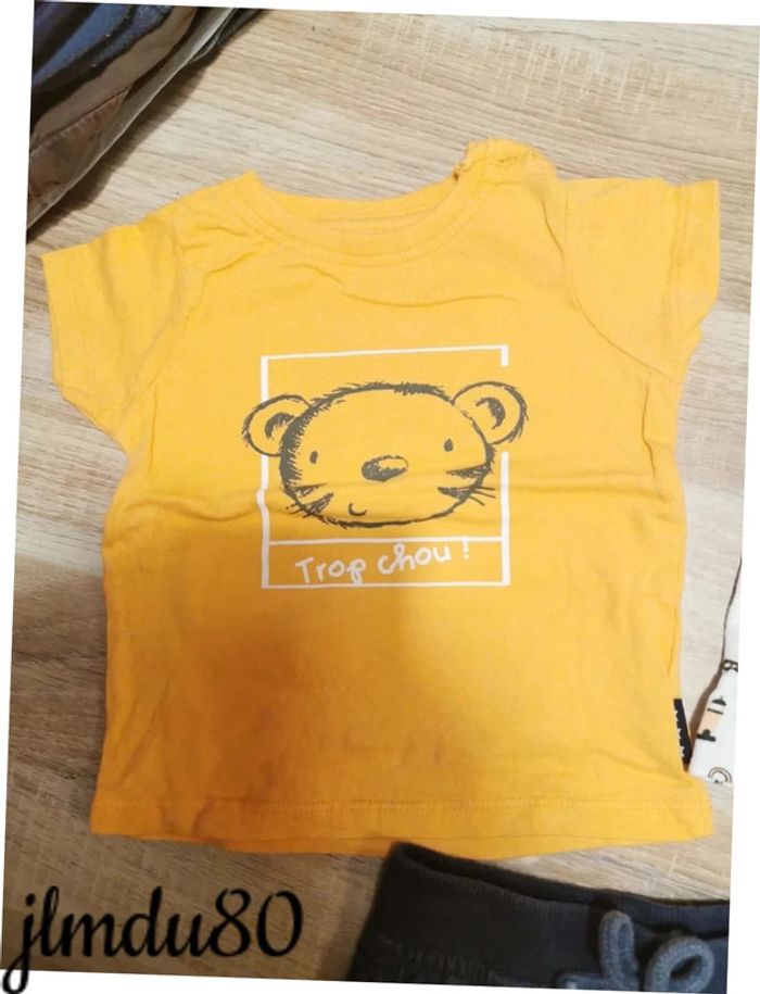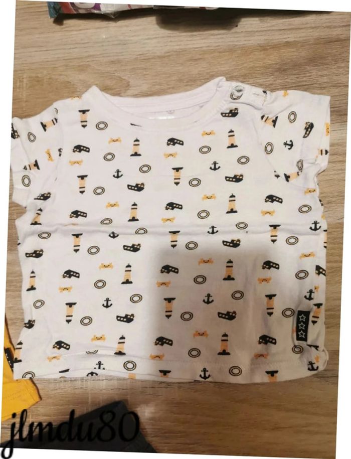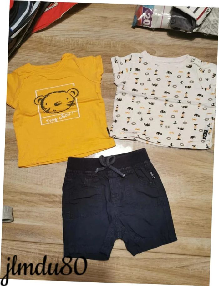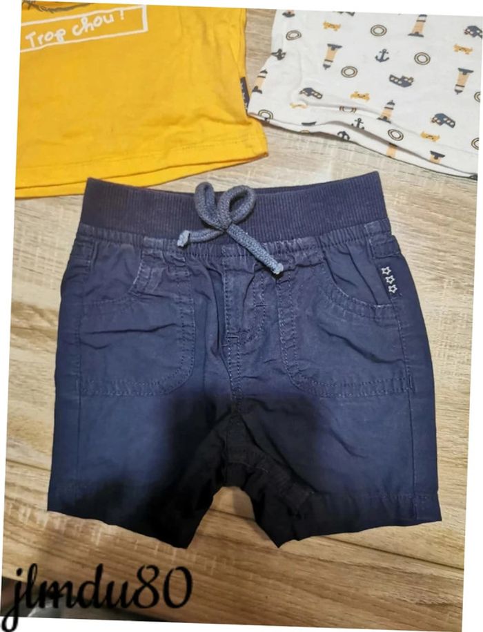 Le de 2 hauts /t-shirt et un petit short bleu marine taille 6 mois marqué mes petits cailloux pour les 3