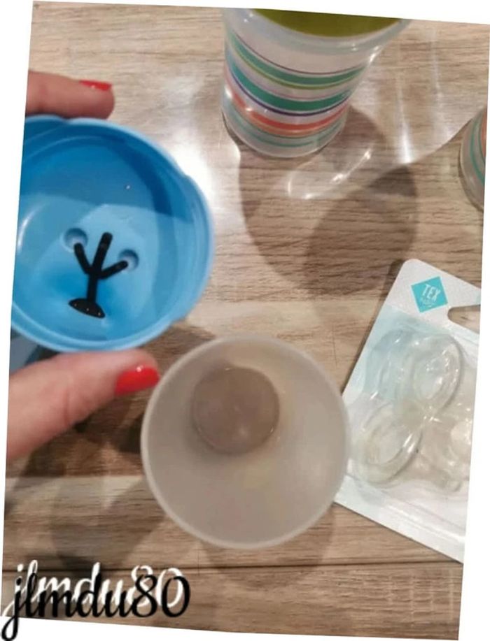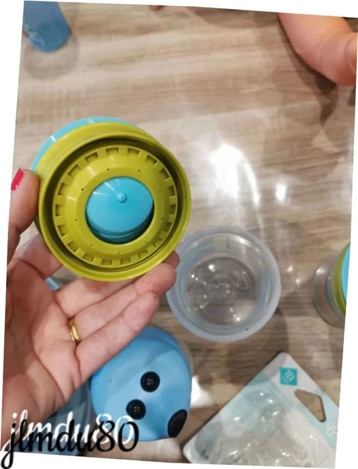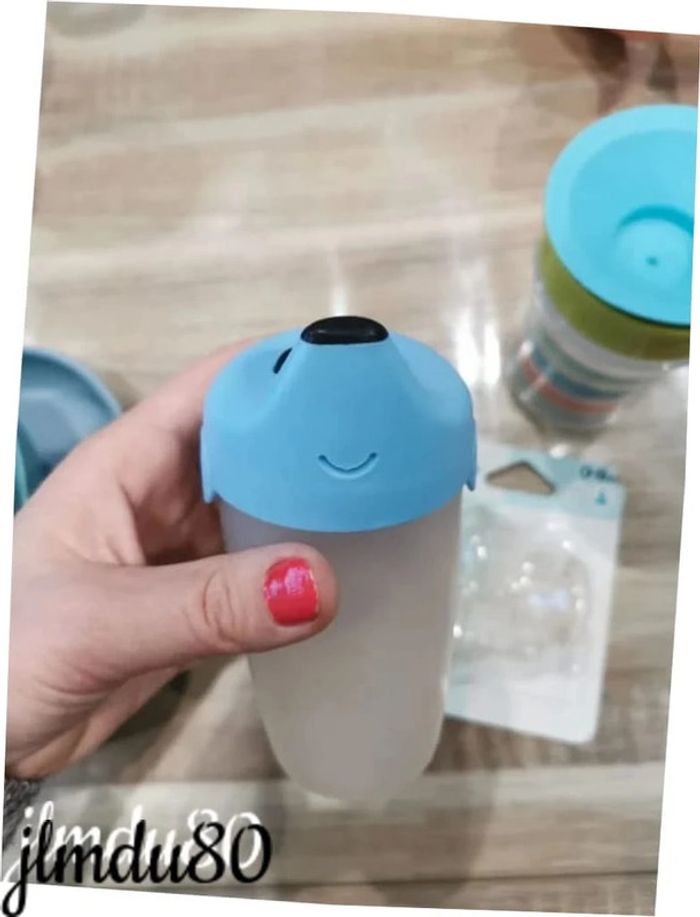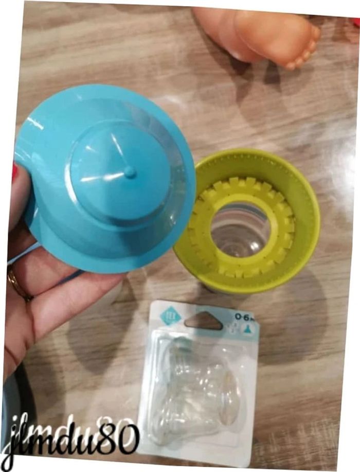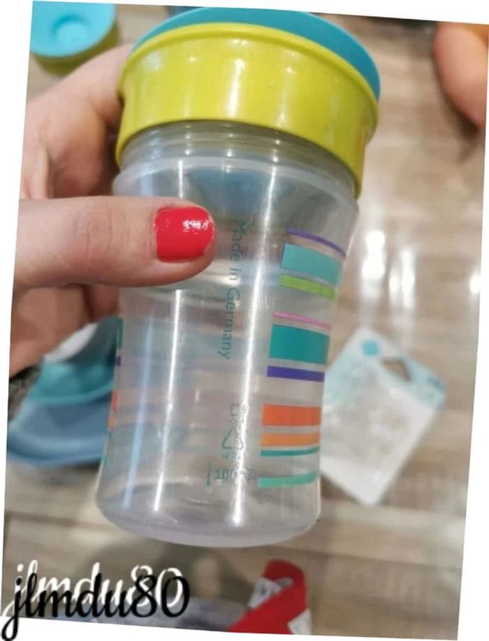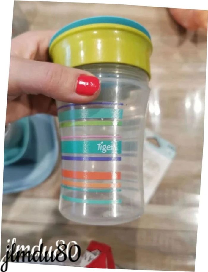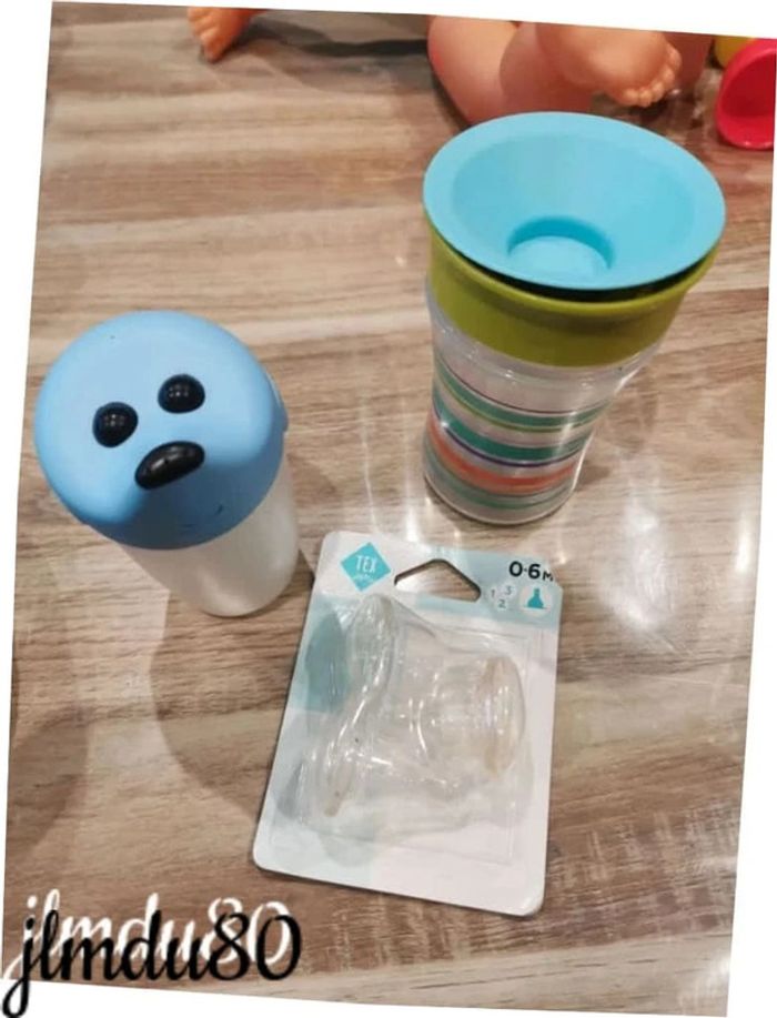 Lot vaisselle composé de Un verre avec couvercle et petit trou pour boire Un tasse anti renversement tigex Bon état Et un lot de 3 tétines neuf