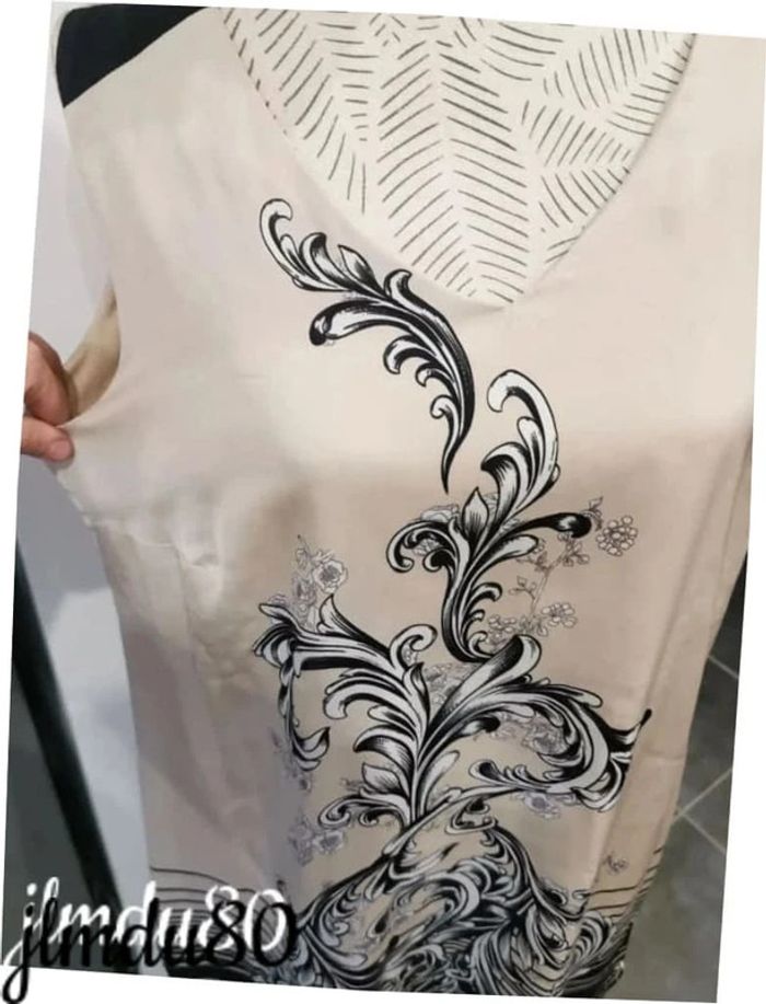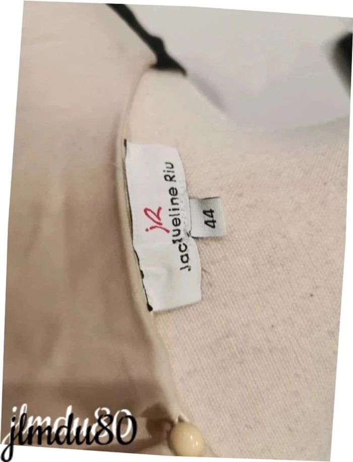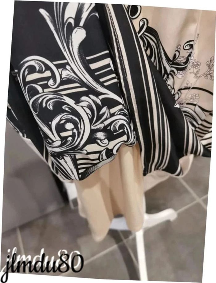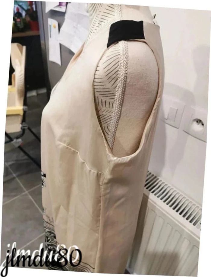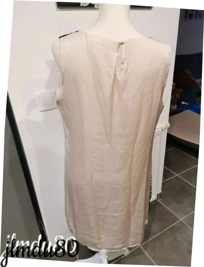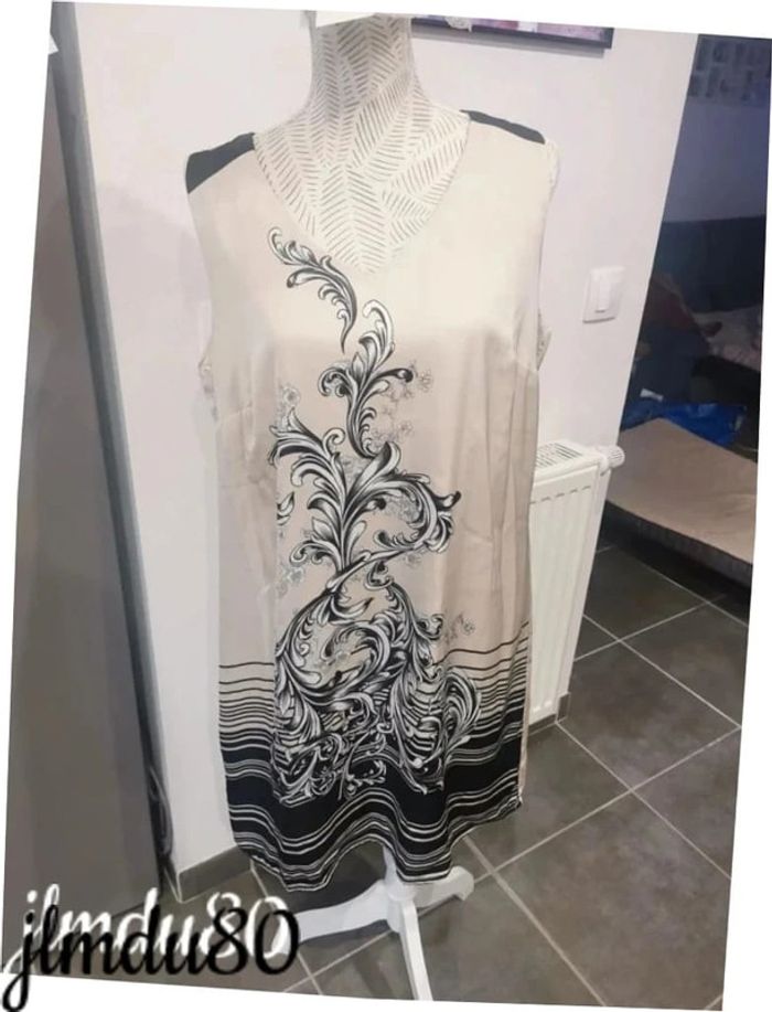 Jolie robe fluide fleuri Couleur beige noir et blanche Elle est doublé, se ferme par un petit bouton en haut du dos. Col V Jacqueline Riu taille 44 mais va plutot à un 42