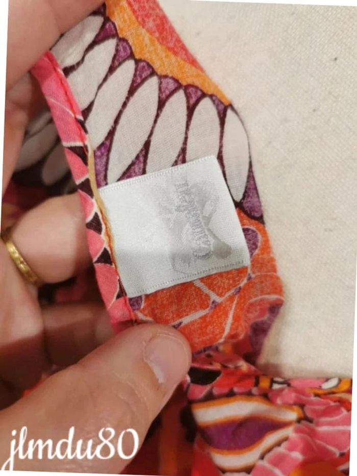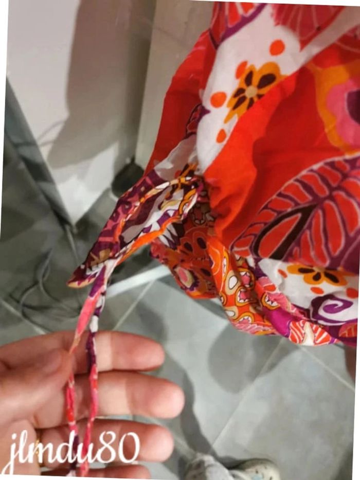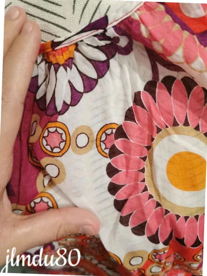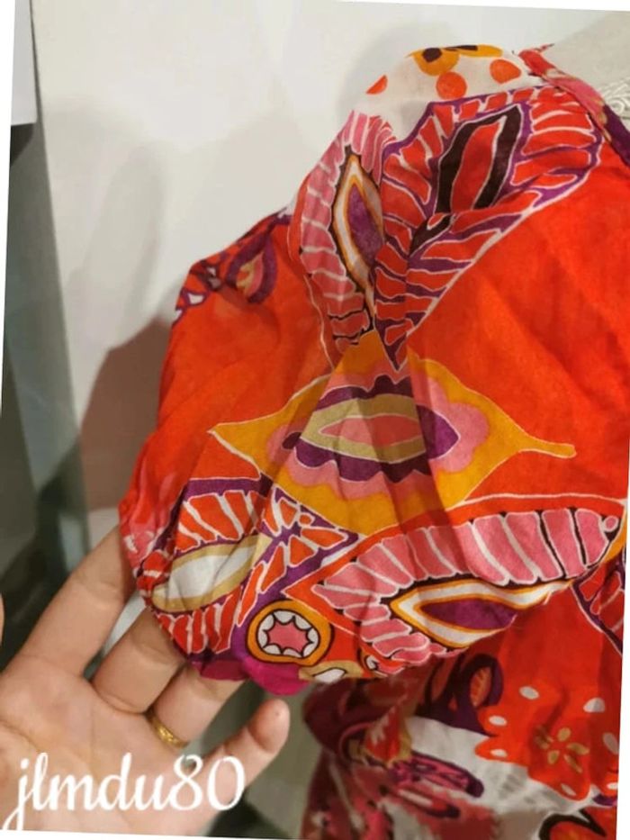 Magnifique blouse fleurit et très coloré Légèrement en transparence Élastique au niveaux des manches Cordons au niveau de la taille pour resserrer Très bon état général