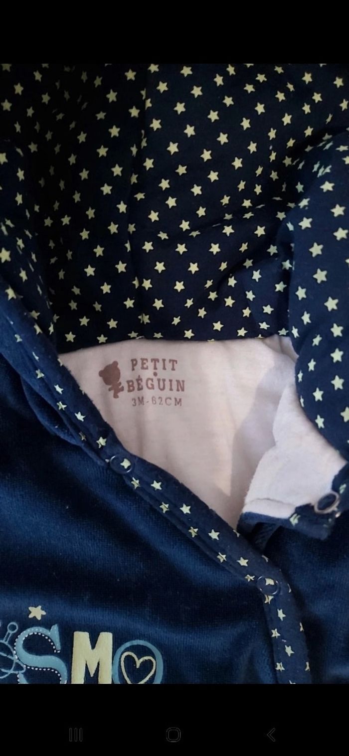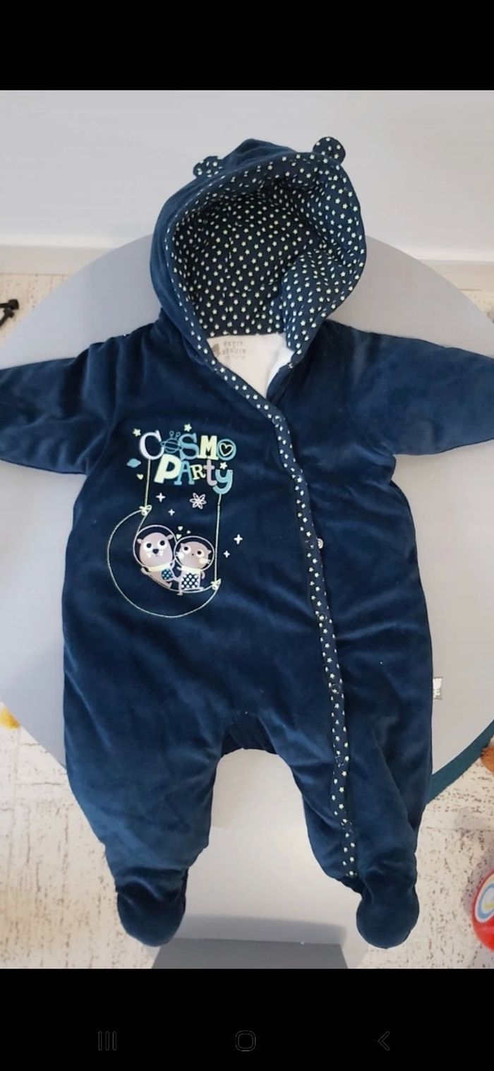 Combi bébé taille 3 mois, bien chaude. Comme neuf Couleur: marine, avec petite étoile vers anis dans la capuche Marque petit beguin