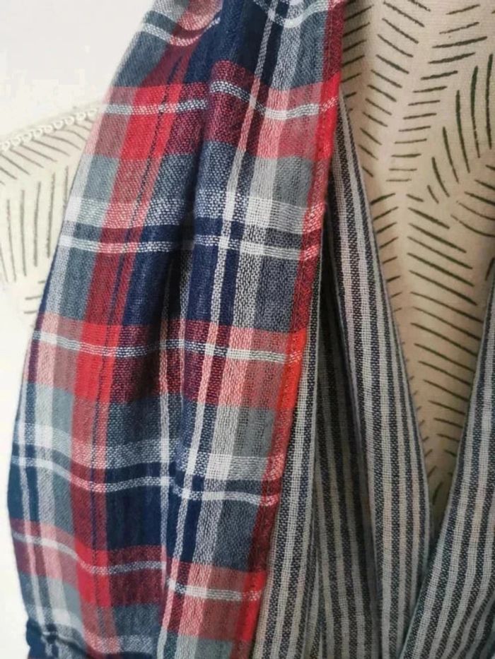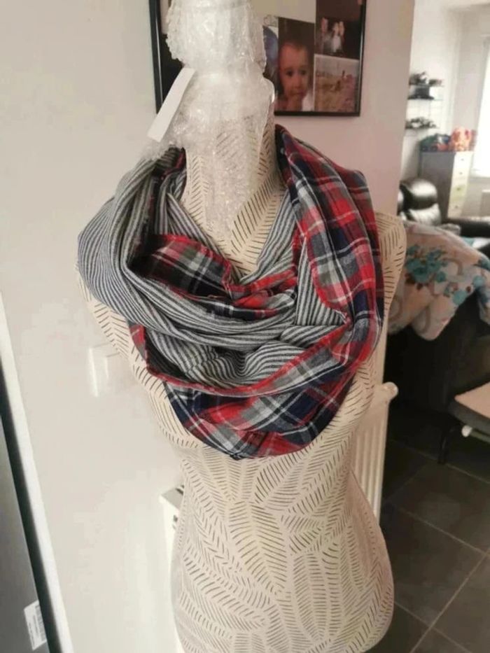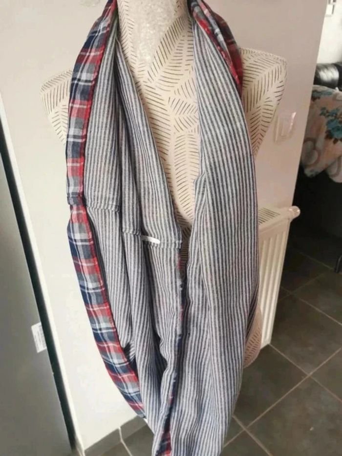 Grand tour de cou bi face, un côté a carreau et l'autre côté en ligne Très bon état Peu se porter de différentes façon