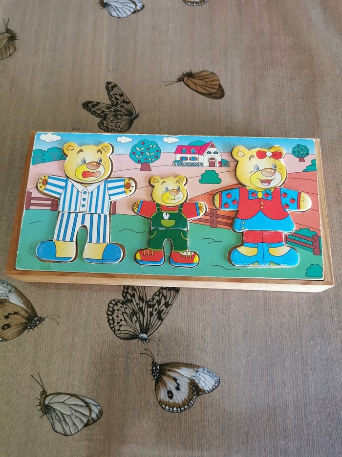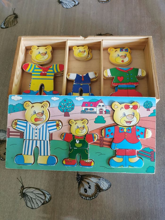 Jeux en bois, 4 tenue et tête avec différentes émotions pour chacun des 3 personnages. Manque 1 tête de maman. Trace d'usure mais reste en bon état