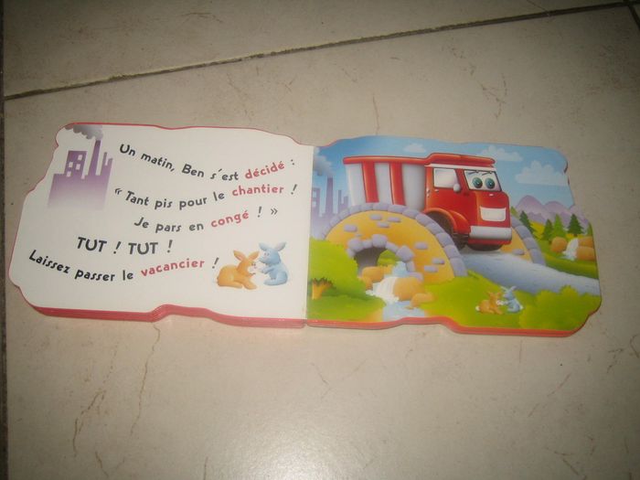 une chouette petite histoire d'un camion benne. Livre cartonné à la forme du camion benne. Très bon état quelques marques d'usures