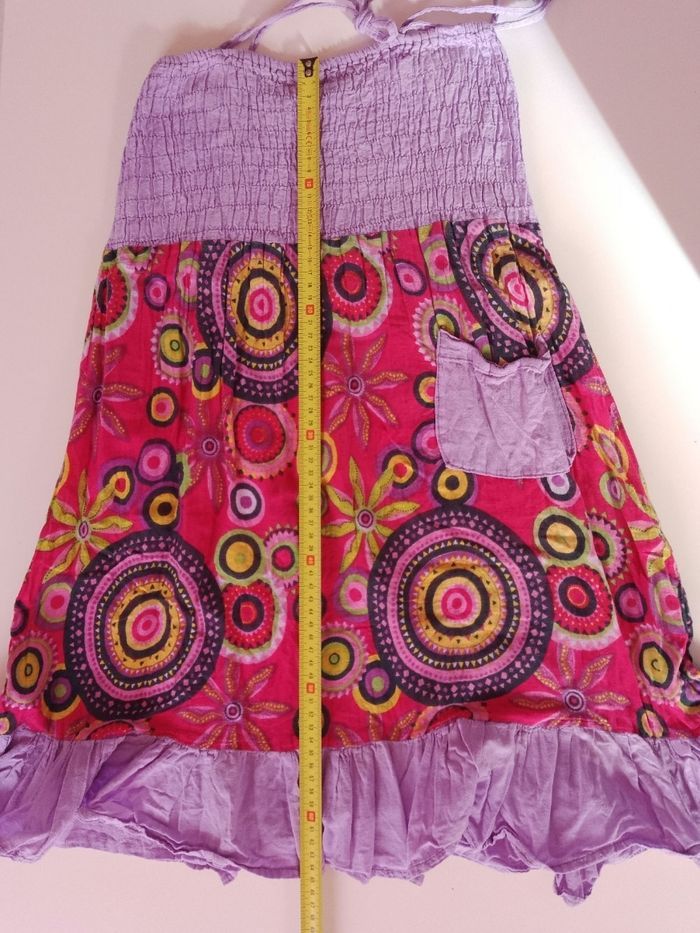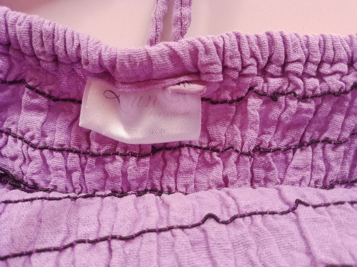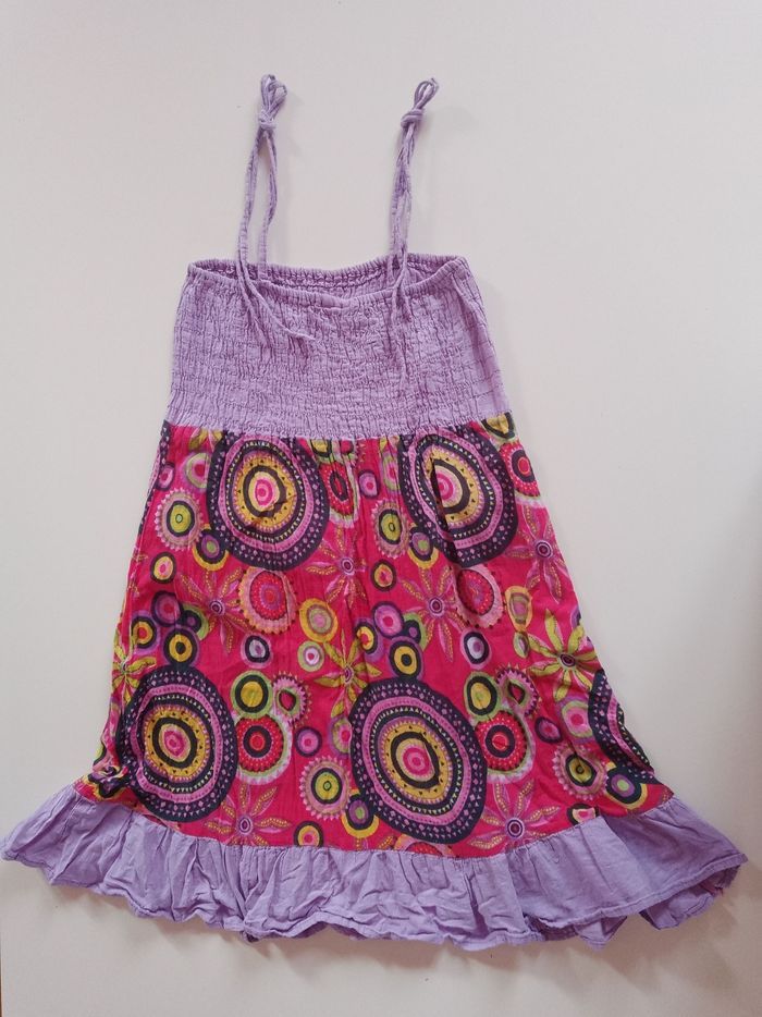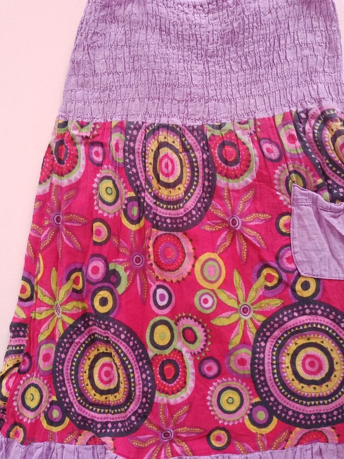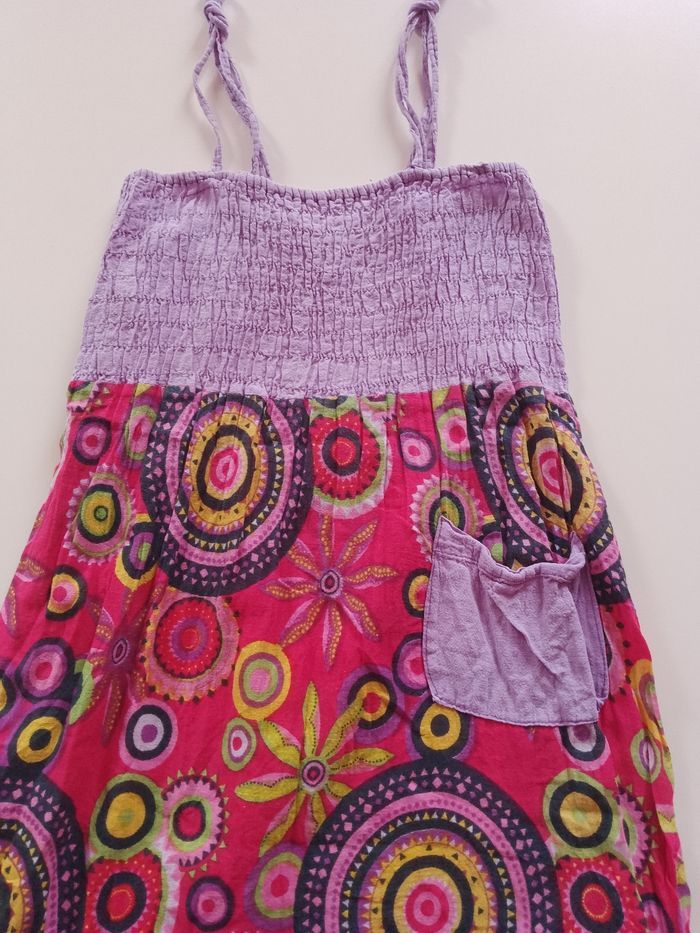 Robe longue à bretelles réglables à souhait par noeuds, smockée, en bon état L'étiquette 6 ans où figure la taille a été coupée. Longueur de la robe hors bretelles : 64 cms