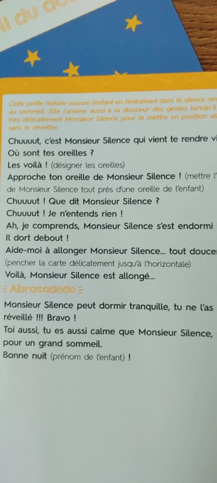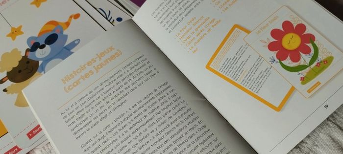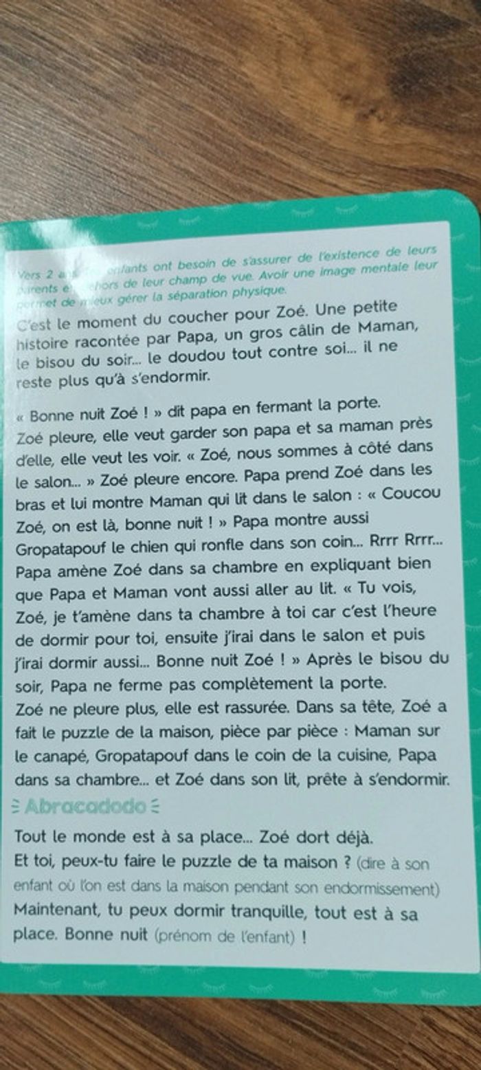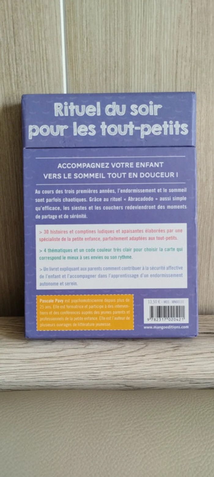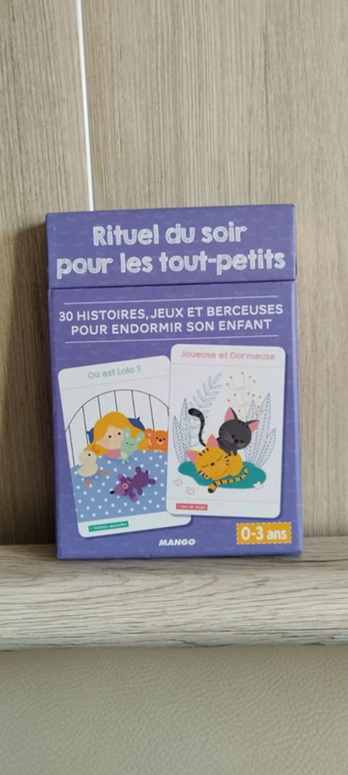 Coffret de 30 fiches, histoires, jeux et berceuse pour endormir son enfant. Accompagner votre enfant vers le sommeil et tout en douceur. 30 histoires et comptines (il manque une fiche, Où est Lolo des histoires apaisantes) 4 thématiques et un code couleur très clair pour choisir la carte qui correspond le mieux à ses envies ou à son rythme Un livret expliquant aux parents comment contribuer à la sécurité affective de l'enfant et l'accompagner dans l' apprentissage d'un endormissement autonome et serein. Édition Julie Cot 2019 Marque Mango Une fiche avec un point de scotch Bon état général. #linejaclivres