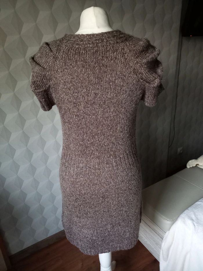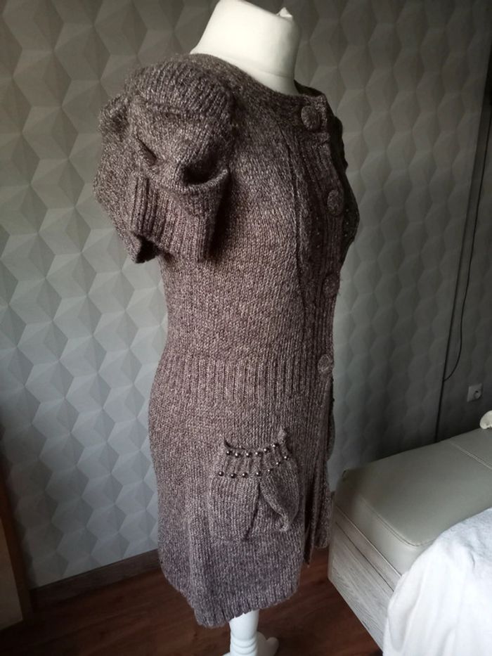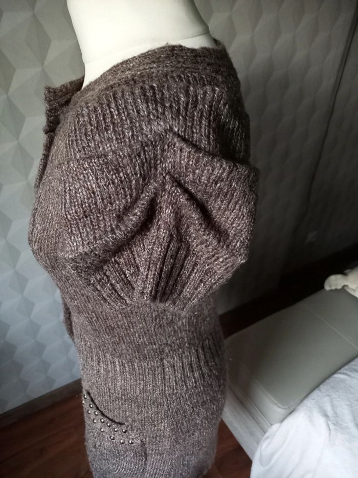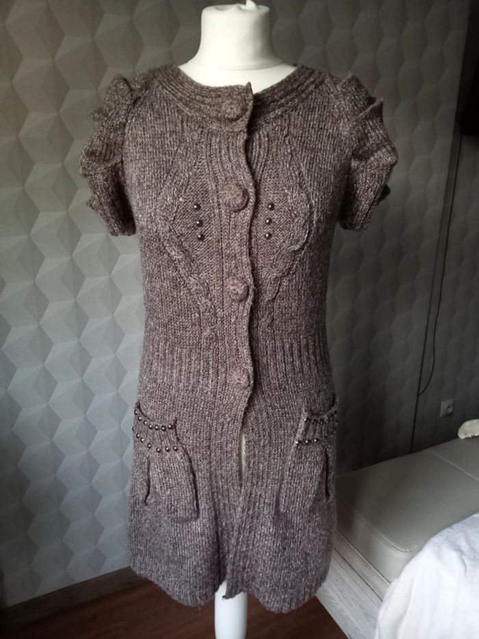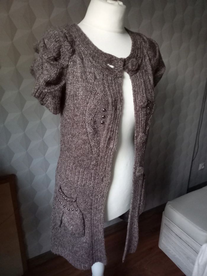 Veste longue 85 cm Manches courtes et plissées Matière acrylique ,polyester, polyamide, elasthanne(ne gratte pas) bouton de rechange Taille 1 (36) Très bon état #linejac36