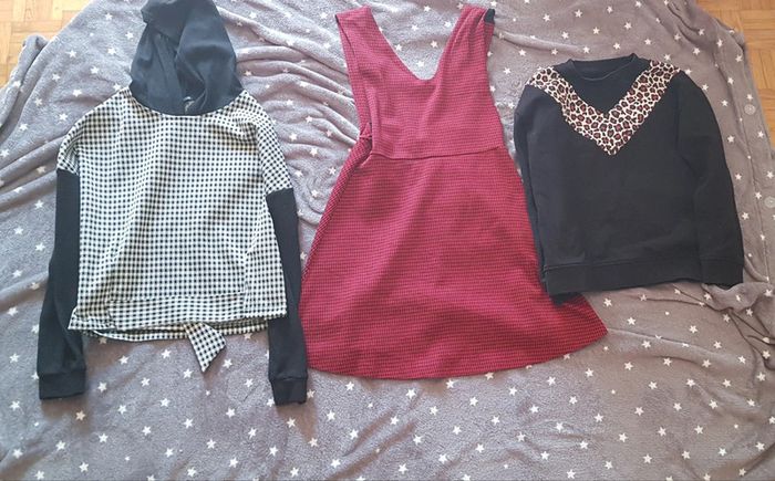 Lot comprenant : 1 haut manches longues et capuche à carreaux noir/ blanc kiabi 1 robe à bretelles à petits carreaux rouge/ noir Zara 1 sweat noir avec motif sur devant ( plus d etiquette. Mesure aisselle à aisselle : 41,5 cm Longueur : 49 cm #sissimimi91fille12ans