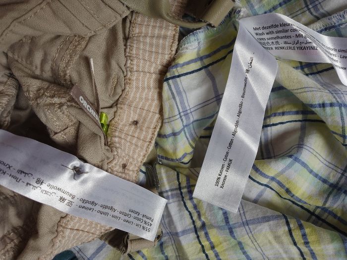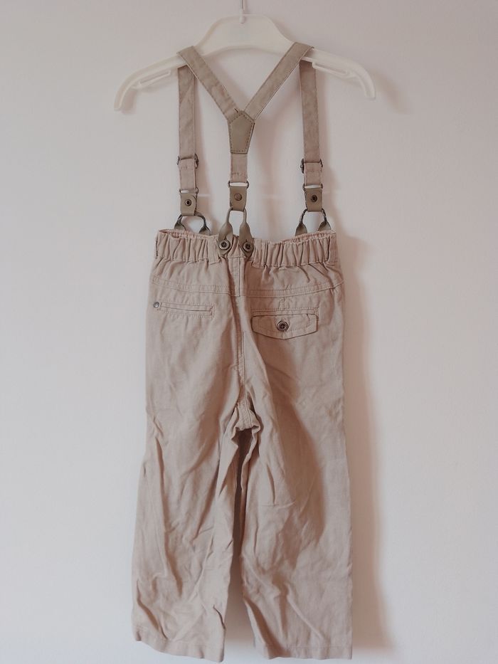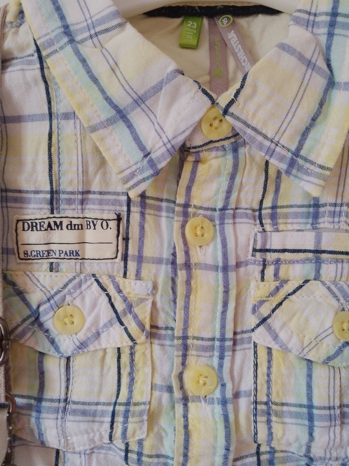 Ensemble pantalon/bretelles amovibles, pantalon en lin (55%) et coton (45%). Chemise légère en coton à manches longues, transformable en manches courtes par patte boutonnée