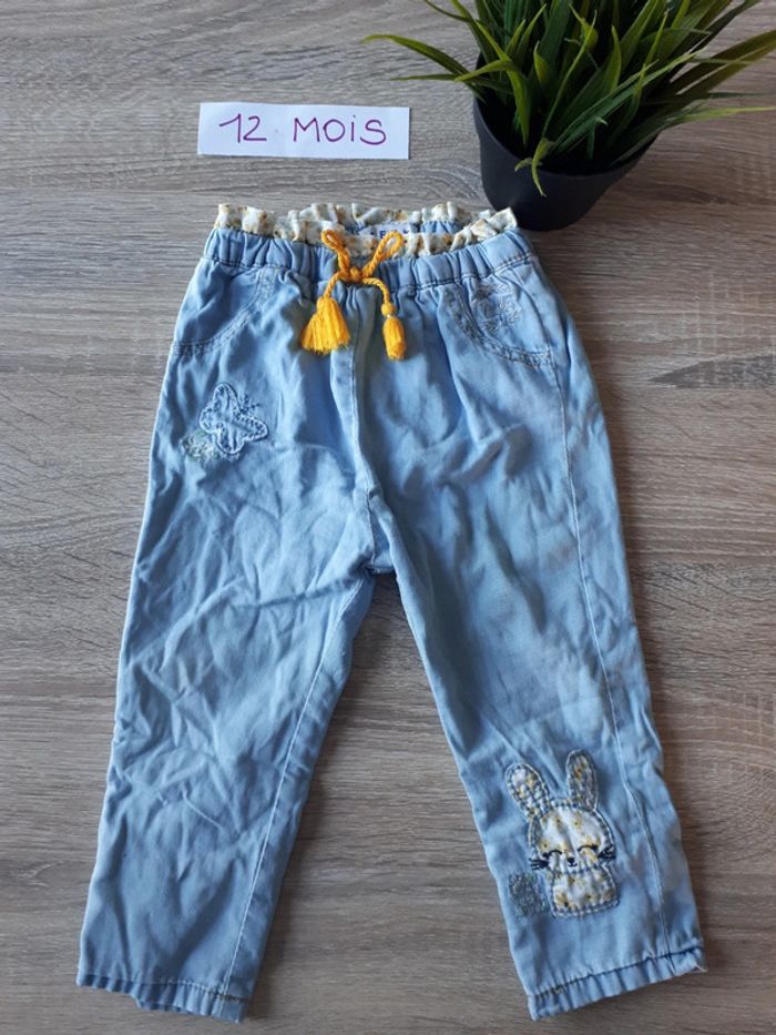 Jean léger, souple. Bleu clair. motifs lapin et papillon. ceinture élastique et noeud décoratif Un peu délavé sur les genoux. Réductions possibles en lot Autres vêtements de la même taille : #mahunopi12mois