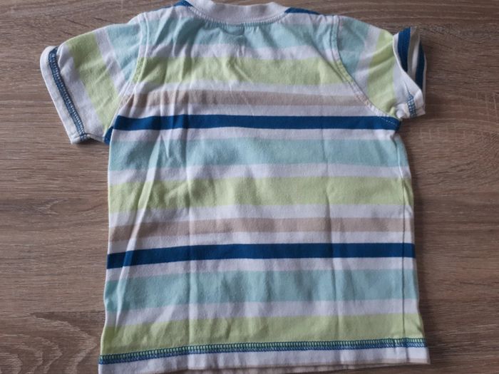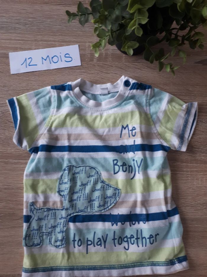 Tee shirt manches courtes. Rayures vertes et bleues. Motif chien. Réductions possibles en lot Autres vêtements de la même taille : #mahunopi12mois