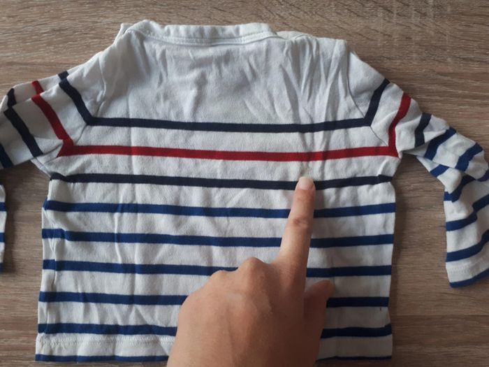 Tee shirt manches longues marinière. Motif bateau. Petites tâches cf : photo Réductions possibles en lot Autres vêtements de la même taille : #mahunopi12mois