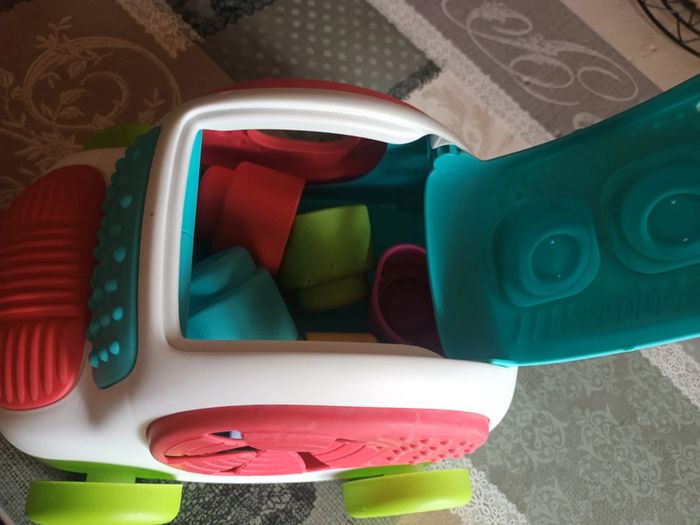 Voiture sensorielles avec plusieurs texture (texture en plastique : point, trait, boules) 6 cubes coloré qui vont avec Le capot rouge se lève, le côté droit pour mettre la main dans la voiture afin de deposer ou prendre un cube Jeux de forme carré sur le côté. Roule #tiitedrey_jeux_jouets