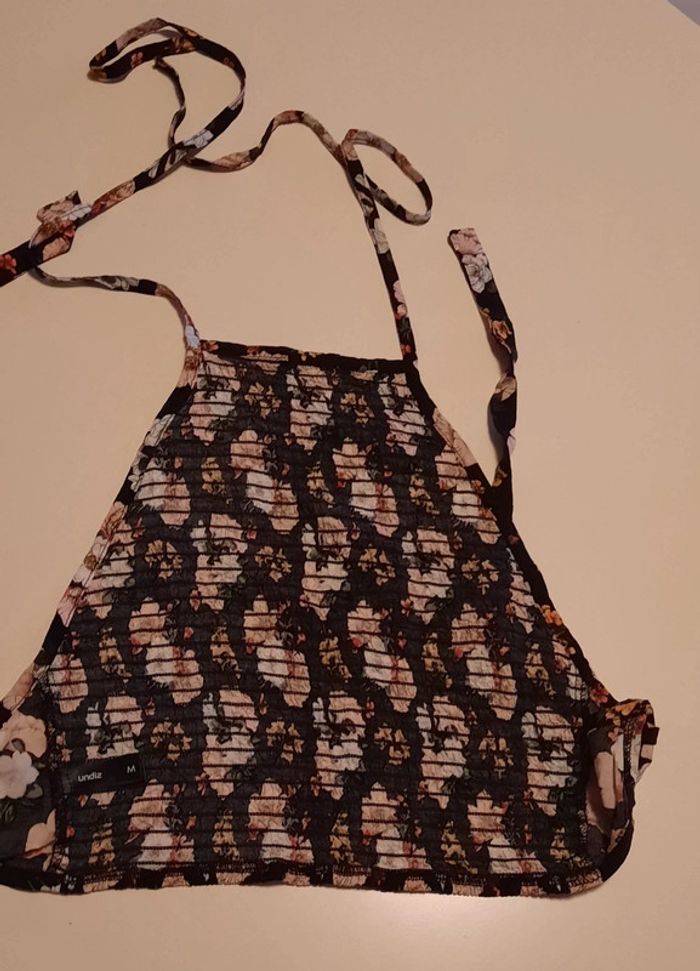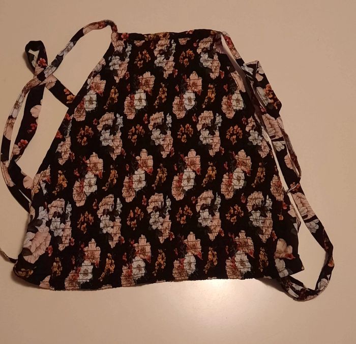Attache par lacets en tissus autour du coup pour le haut et bas du dos, bleu marine à fleurs