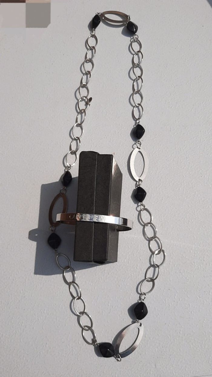 Collier long +collier rigide inscription "carpe diem " métal argenté