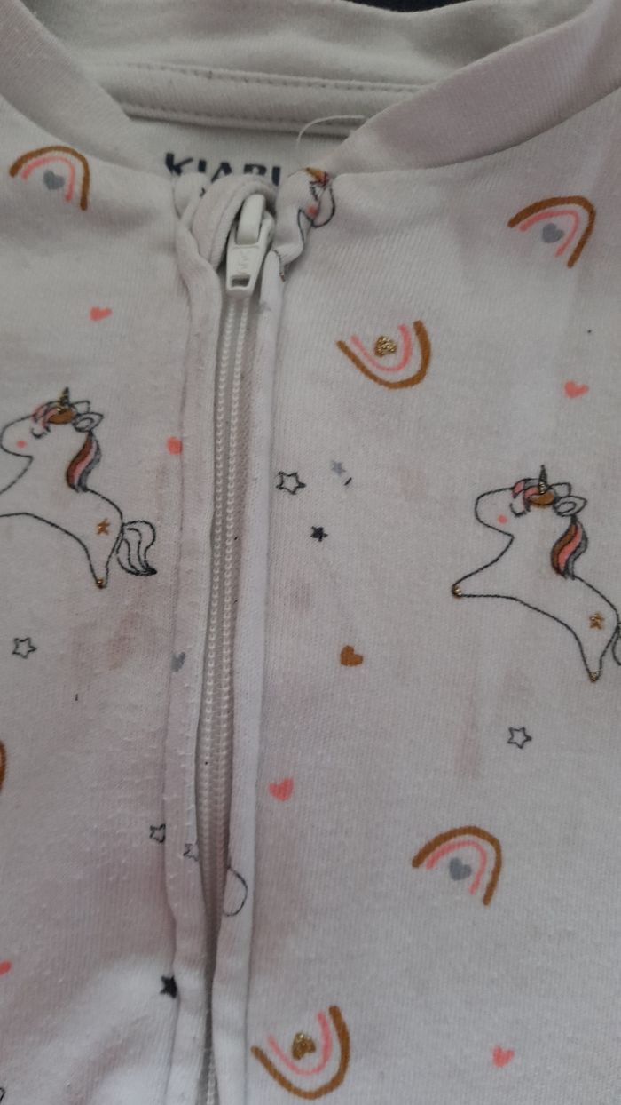 Pyjama leger coton, motifs licorne à étoiles brillante, fermeture par zip du pied au col. Petites tâches au col(voir photo) pourraient être effacées avec un détachant.