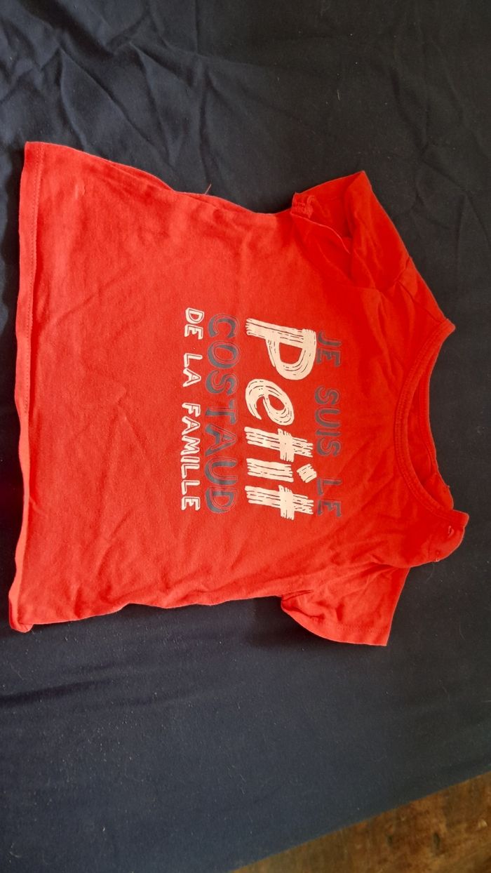 Tee shirt rouge à manches courtes, coton, message Je suis le petit costaud de la famille