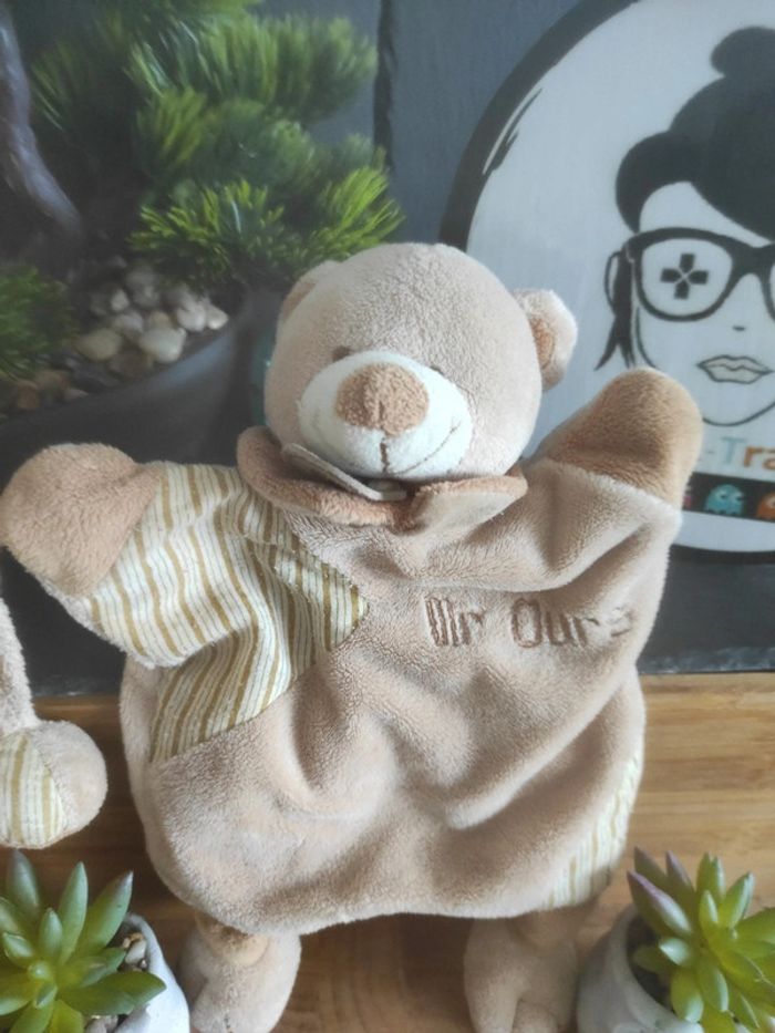 doudou baby Nat' Knuffel Marionnette Mr Ours Marron Beige Rayé   #geektradedoudou Ours marionnette beige marron Broderie Mr ours Rayures Nom et prénom inscrit sur l étiquette marque doudou baby nat' Afin de ne pas abîmer les doudous et de laisser le choix dans l'utilisation de la lessive les peluches ne sont pas lavées avant envoi Description complément : Petit nettoyage à prévoir Vous achetez ce que vous voyez les photos font entièrement partie de la description Transport : Les frais de transport comprennent les frais du transporteur ainsi que l'emballage pour protéger au mieux votre achat. Chaque achat est envoyé en format colis avec numéro de suivi Le poids du colis est de 500g finit (je ne peux pas faire moins) il peut donc y avoir plusieurs objets dans le carton si vous le souhaitez (contactez moi afinde grouper les frais de port) Référencement : #geektradedoudou #peluche #plush  #doudou #enfant #bebe