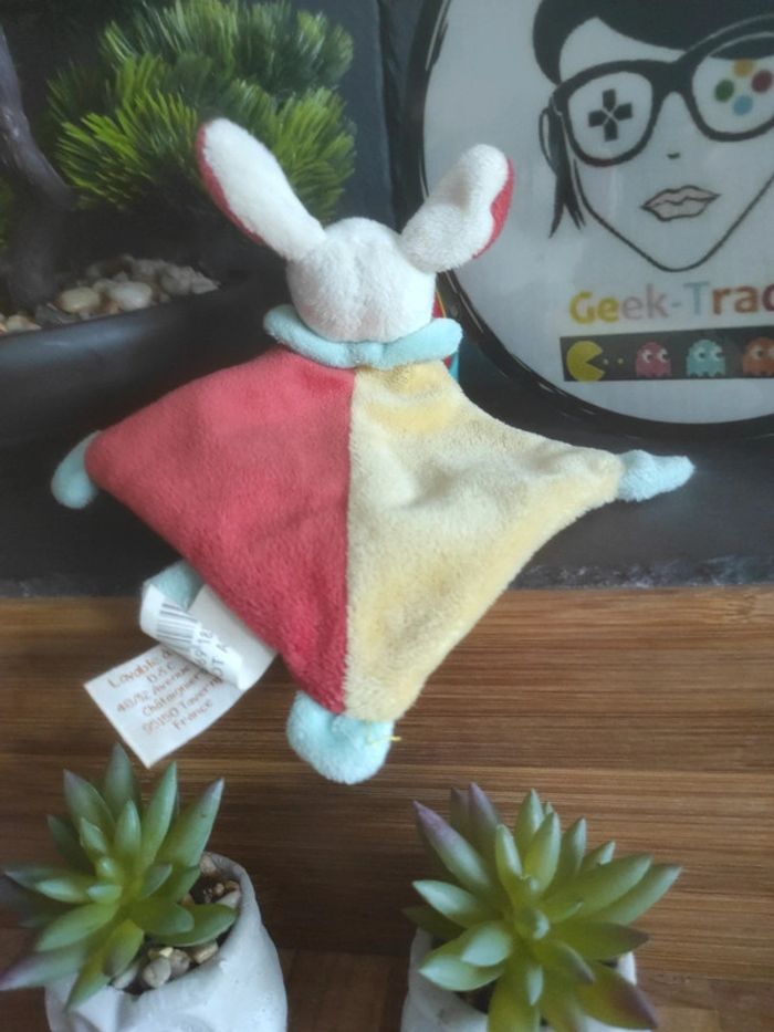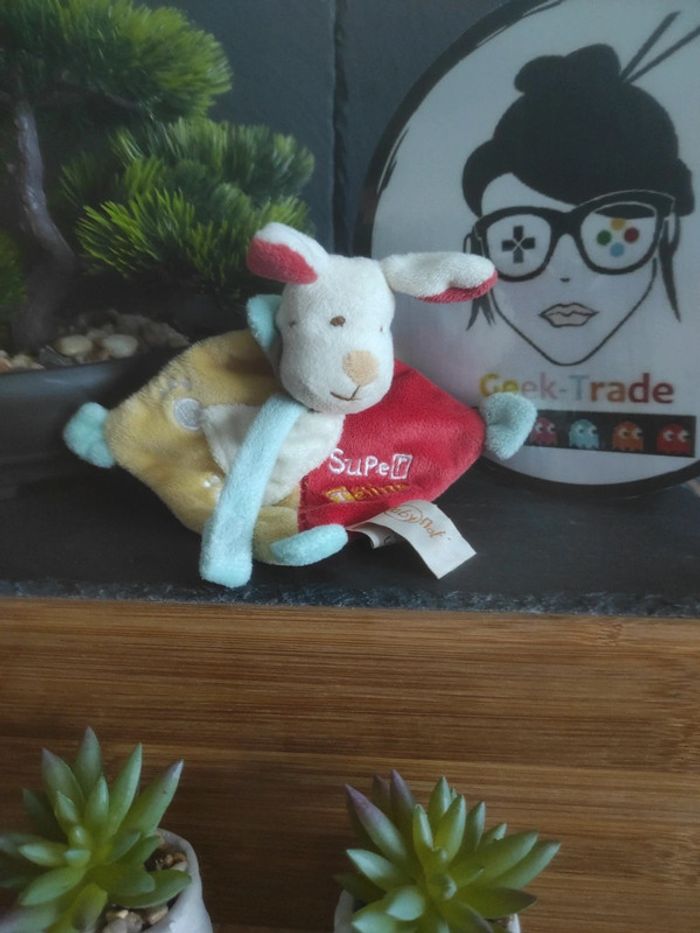 Doudou Attache Tétine Chien Baby Nat Super Tetine Plat mouchoir #geektradedoudou Chien blanc Doudou rouge et jaune forme losange Broderie super tétine et pattes de chien Attache tétine Il a eu une longue vie . Il est usé par endroits Bon etat Afin de ne pas abîmer les doudous et de laisser le choix dans l'utilisation de la lessive les peluches ne sont pas lavées avant envoi Description complément : Petit nettoyage à prévoir Vous achetez ce que vous voyez les photos font entièrement partie de la description Transport : Les frais de transport comprennent les frais du transporteur ainsi que l'emballage pour protéger au mieux votre achat. Chaque achat est envoyé en format colis avec numéro de suivi Le poids du colis est de 500g finit (je ne peux pas faire moins) il peut donc y avoir plusieurs objets dans le carton si vous le souhaitez (contactez moi afinde grouper les frais de port) Référencement : #geektradedoudou #peluche #plush  #doudou #enfant #bebe