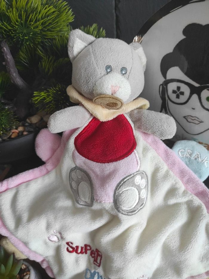 Doudou Chat Super Doudou Baby Nat' Gris Rose  plat mouchoir  #geektradedoudou - photo numéro 1