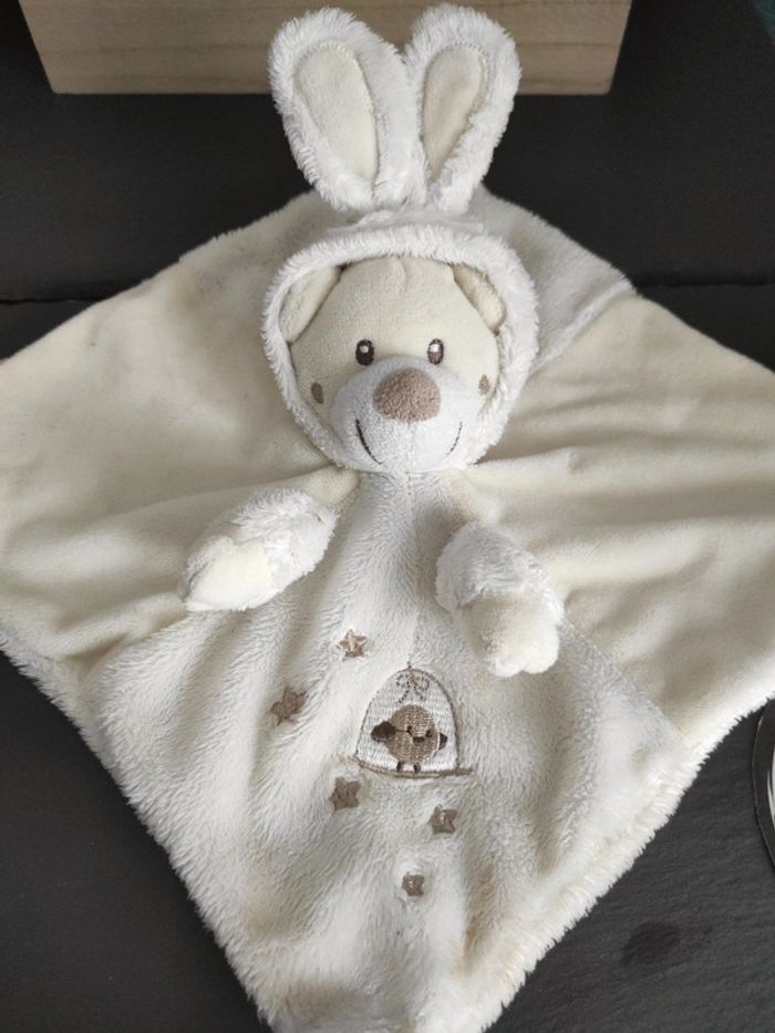 Lapin À Capuche Gémo Blanc Beige Oiseau doudou plat mouchoir  #geektradedoudou - photo numéro 1