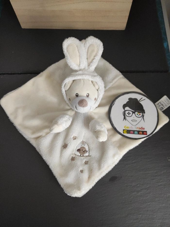 Lapin À Capuche Gémo Blanc Beige Oiseau doudou plat mouchoir  #geektradedoudou