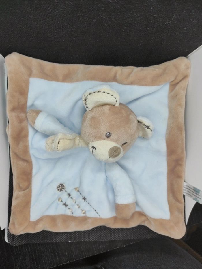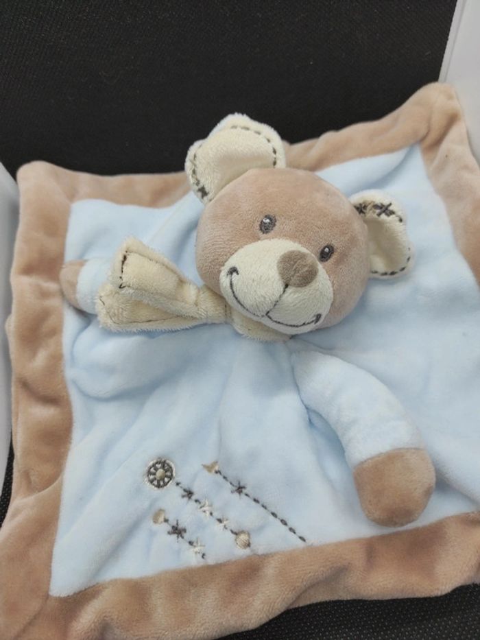 Ours bleu et marron Simba toys blankie doudou plat mouchoir  #geektradedoudou Ours avec écharpe Marron beige et bleu clair Quelques tâches superficielles à nettoyer Une tâche a l arrière du mouchoir voir photo Afin de ne pas abîmer les doudous et de laisser le choix dans l'utilisation de la lessive les peluches ne sont pas lavées avant envoi Bel état Étiquette lisible Description complément : Petit nettoyage à prévoir Vous achetez ce que vous voyez les photos font entièrement partie de la description Transport : Les frais de transport comprennent les frais du transporteur ainsi que l'emballage pour protéger au mieux votre achat. Chaque achat est envoyé en format colis avec numéro de suivi Le poids du colis est de 500g finit (je ne peux pas faire moins) il peut donc y avoir plusieurs objets dans le carton si vous le souhaitez (contactez moi afinde grouper les frais de port) Référencement : #geektradedoudou #peluche #plush  #doudou #enfant #bebe #disney