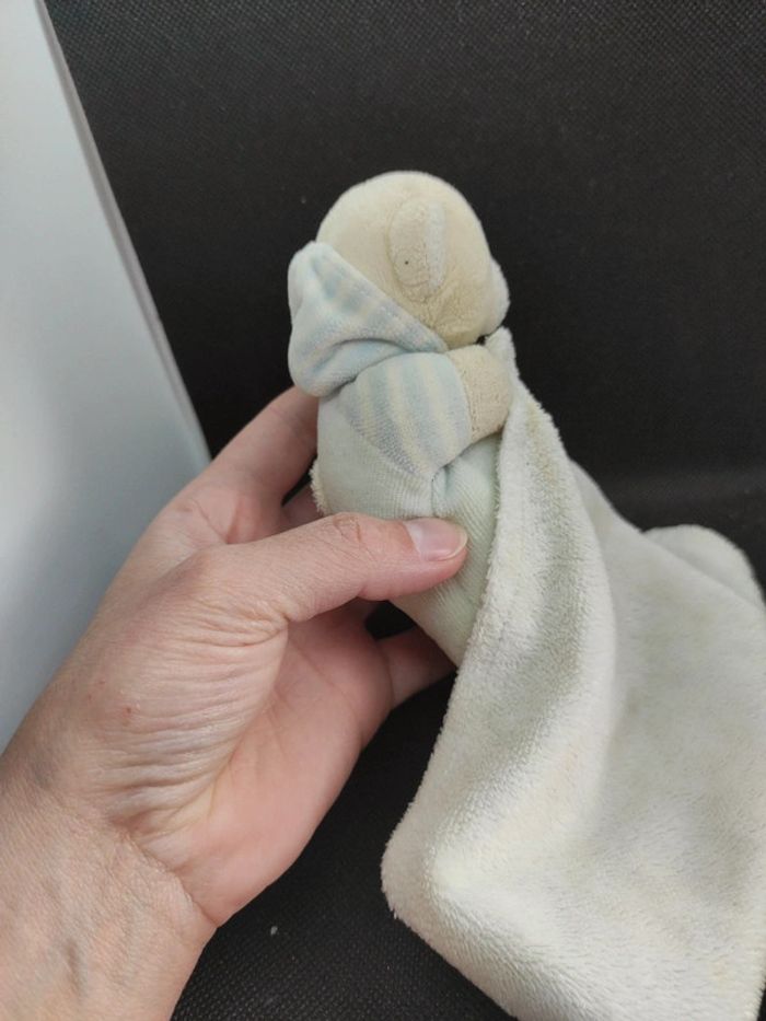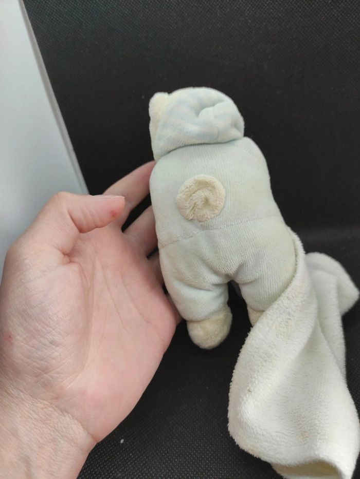 Ours blanc bleu kimbaloo doudou plat mouchoir  #geektradedoudou Ours blanc qui dort avec pyjama bleu et blanc rayé avec capuche Doudou qui a bien vécu  il a des tâches à voir si elles partiront au lavage Afin de ne pas abîmer les doudous et de laisser le choix dans l'utilisation de la lessive les peluches ne sont pas lavées avant envoi Bel état Étiquette lisible Description complément : Petit nettoyage à prévoir Vous achetez ce que vous voyez les photos font entièrement partie de la description Transport : Les frais de transport comprennent les frais du transporteur ainsi que l'emballage pour protéger au mieux votre achat. Chaque achat est envoyé en format colis avec numéro de suivi Le poids du colis est de 500g finit (je ne peux pas faire moins) il peut donc y avoir plusieurs objets dans le carton si vous le souhaitez (contactez moi afinde grouper les frais de port) Référencement : #geektradedoudou #peluche #plush  #doudou #enfant #bebe #disney #nicotoy