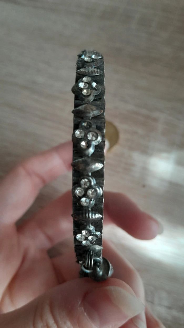 Vintage authentique B e style argent vieilli, en fantaisie. Manque 2 strass. Diamètre intérieur 6.5cm