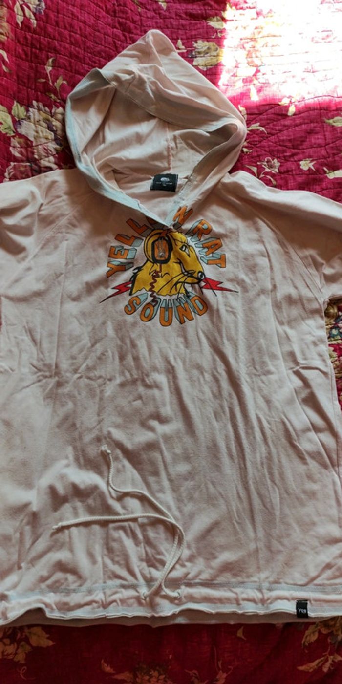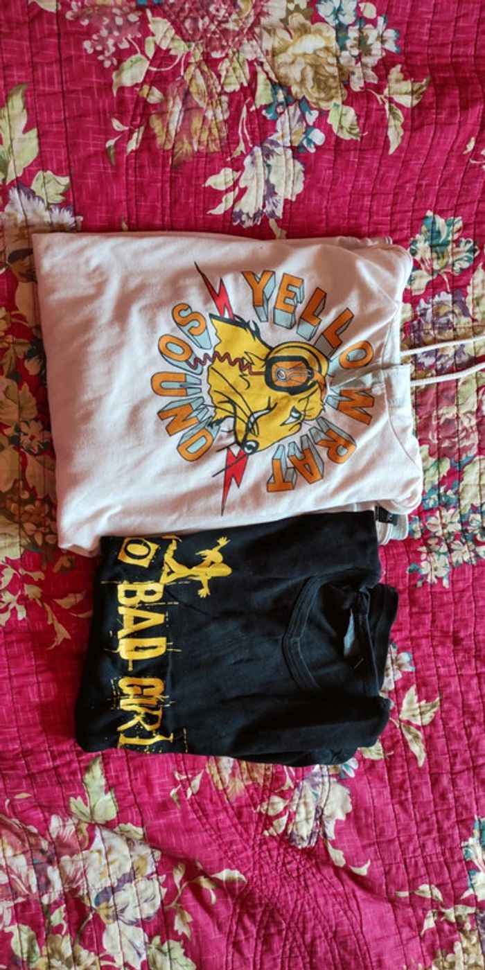 Lot 2 tee Shirts taille L. État satisfaisant car petites tâches sur chaque Le noir marque Kiabi. Le dessin commence à se craqueler et il y a des petites tâches de javel sur le bas du tee shirt Le rose très très pâle. Marque yellow rat bastard. En bon état sauf la petite tâche en bas presque pas visible. Capuche et lien de serrage en bas. #crisgaet83_vetementsfemmetaillel
