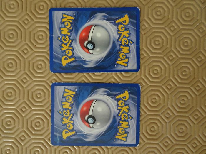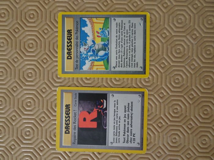 2 cartes pokemon dresseur, années 1995-2000. Des traces d'usure. - repaire des Rocket ! - test de personnalité des Pokémon