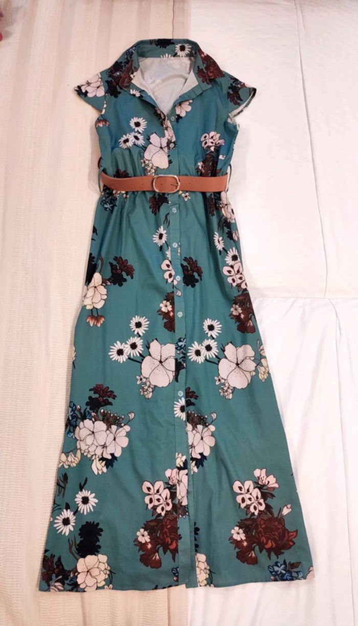 Robe longue fleurie bleue avec ceinture, taille S, très bon état. Tissu léger. #robelongue #robelonguefleurie #alinel5403femme
