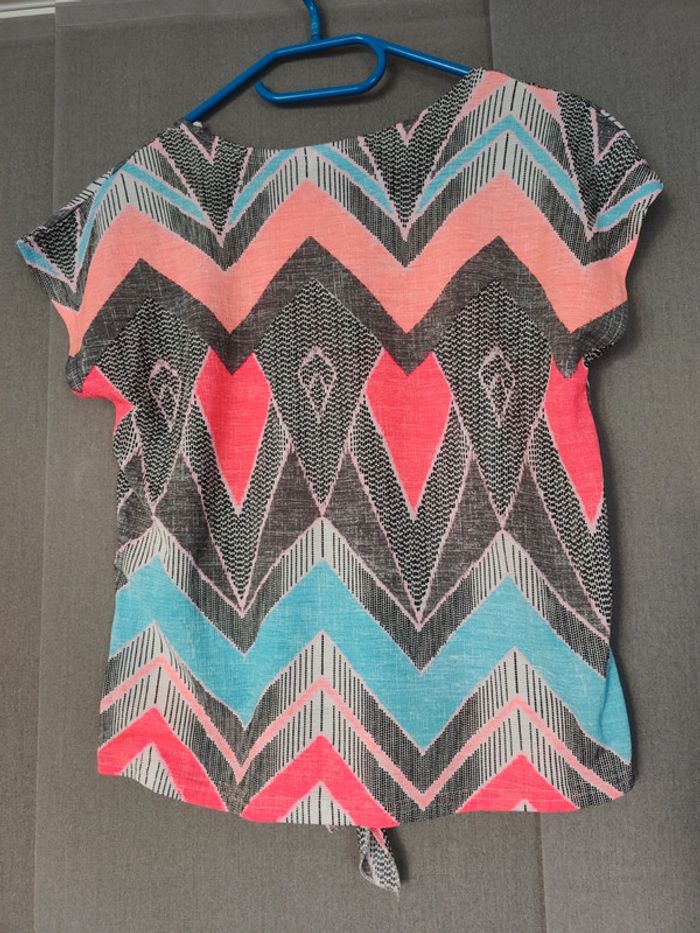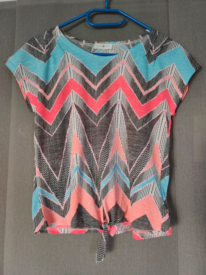 T shirt multicolore motifs fluos avec noeud devant, en très bon état, peu porté. #cachecache #noeud #tshirtfluo #alinel5403femme