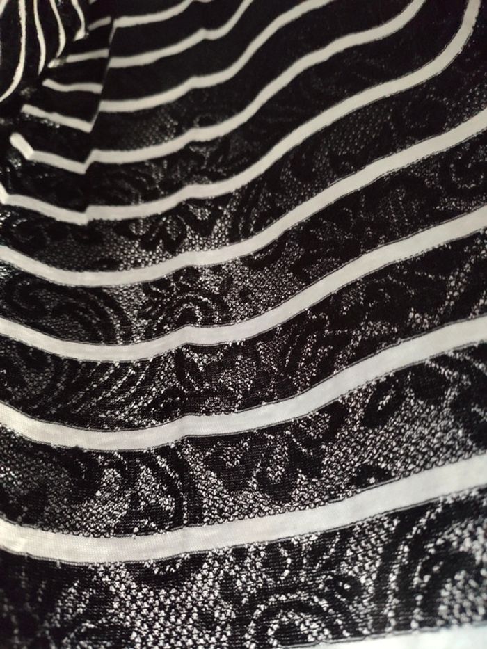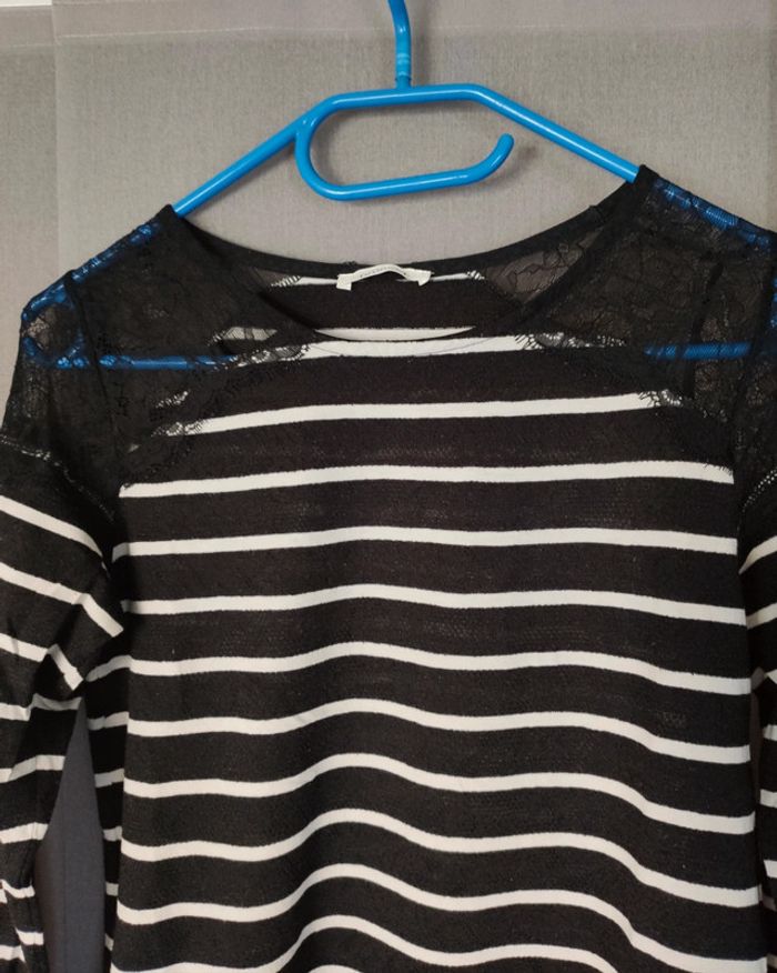 T shirt manches longues rayé noir et blanc avec détails dentelle et motifs légèrement transparent. #alinel5403femme