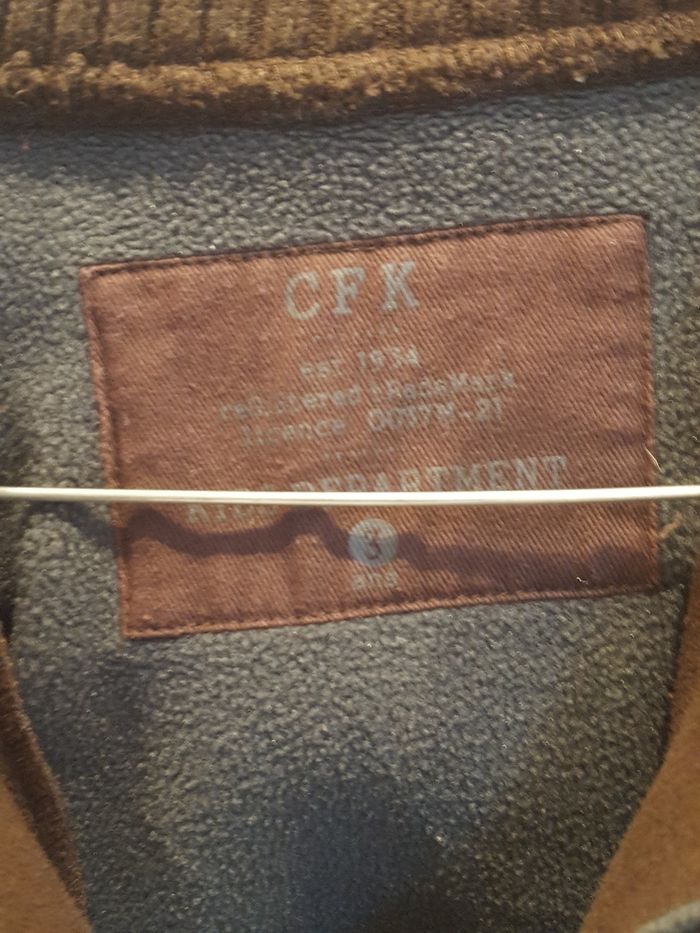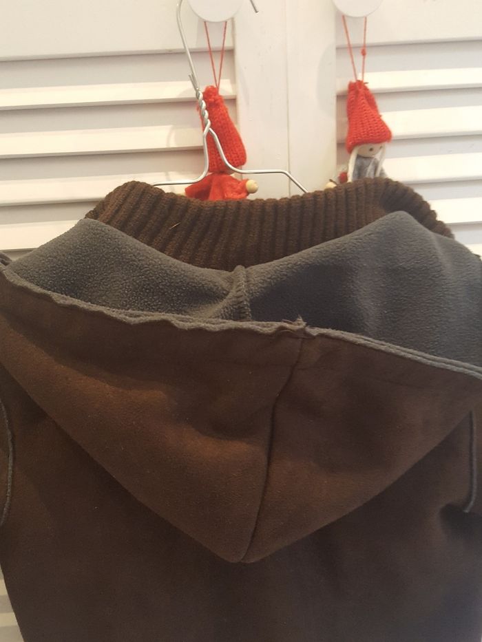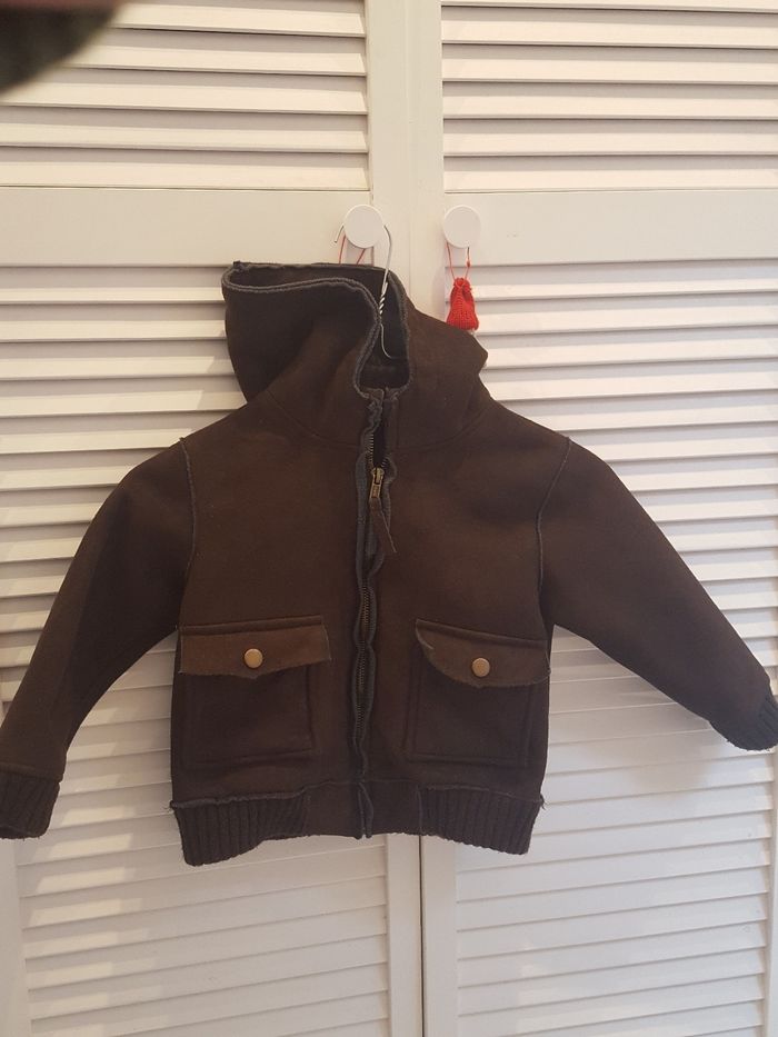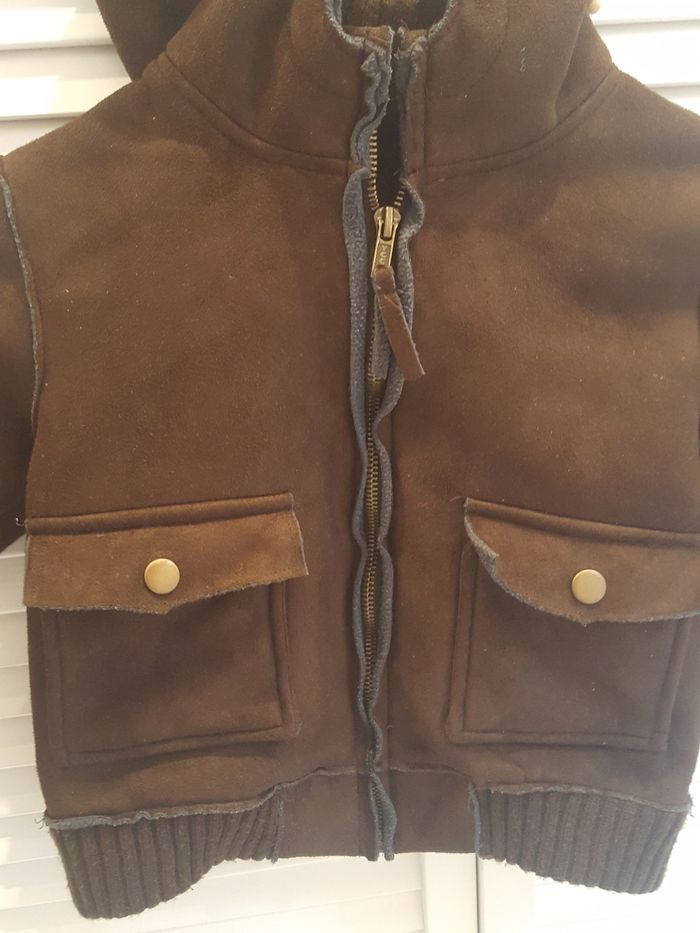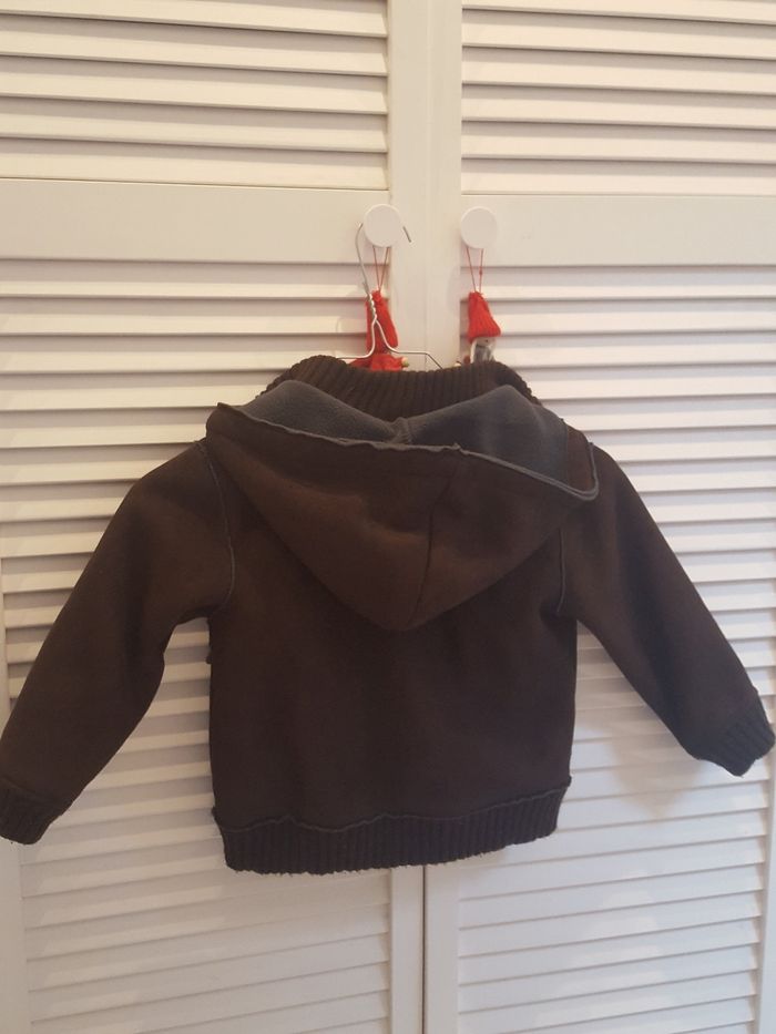 Manteau en daim marron avec capuche marque CFK 3 ans. Fermeture zippee, 2 poches avec boutons pression. Excellent état.