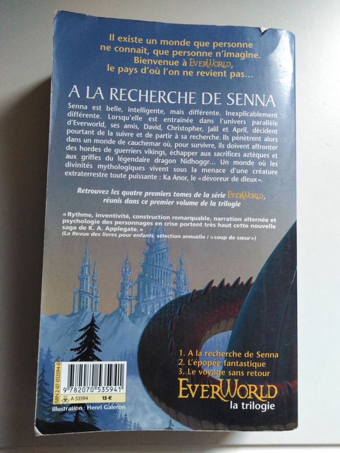 A la recherche de Senna de K.A. Applegate Premier tome de la trilogie Everworld Fantastique Reliure cassée et couverture légèrement abimée