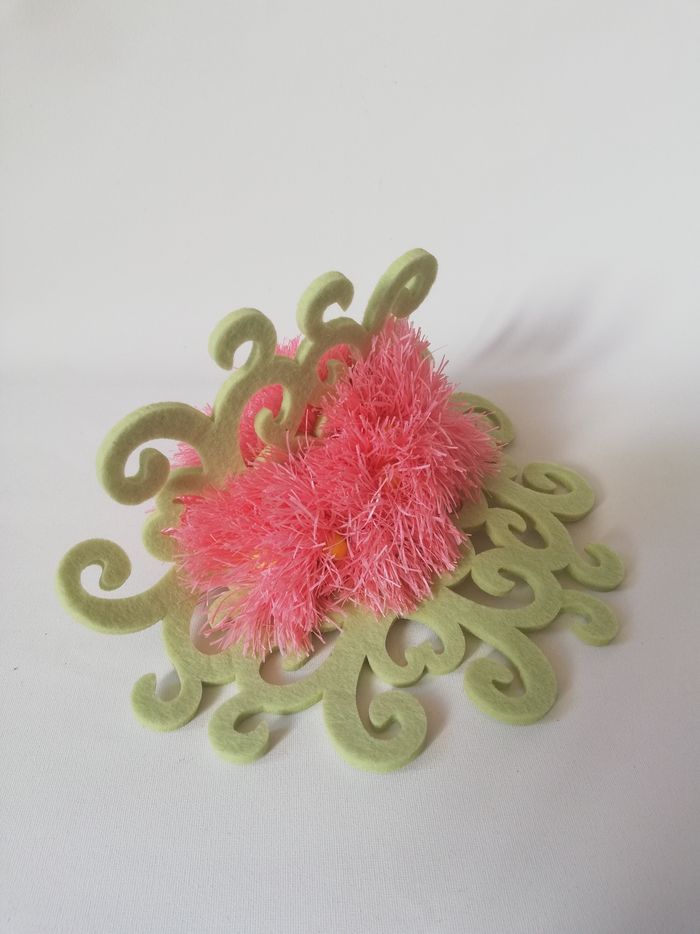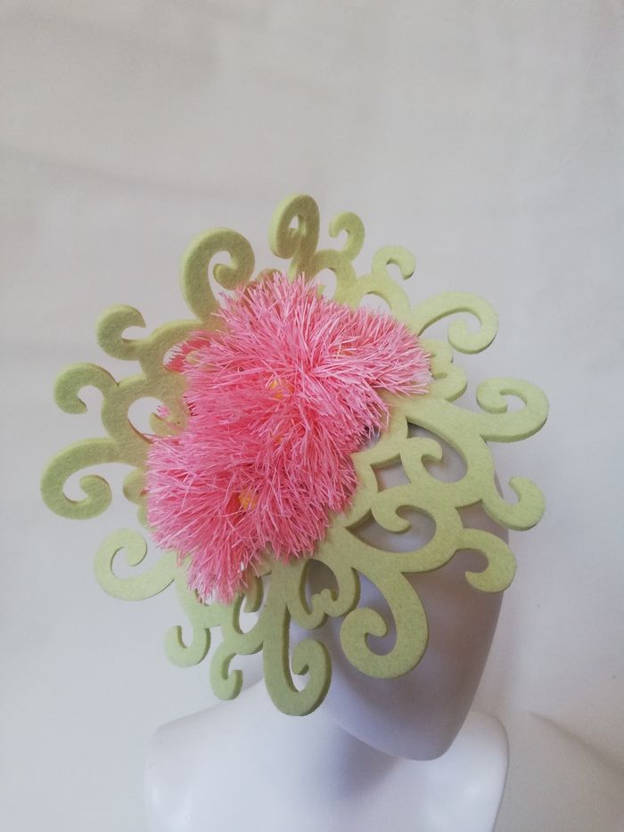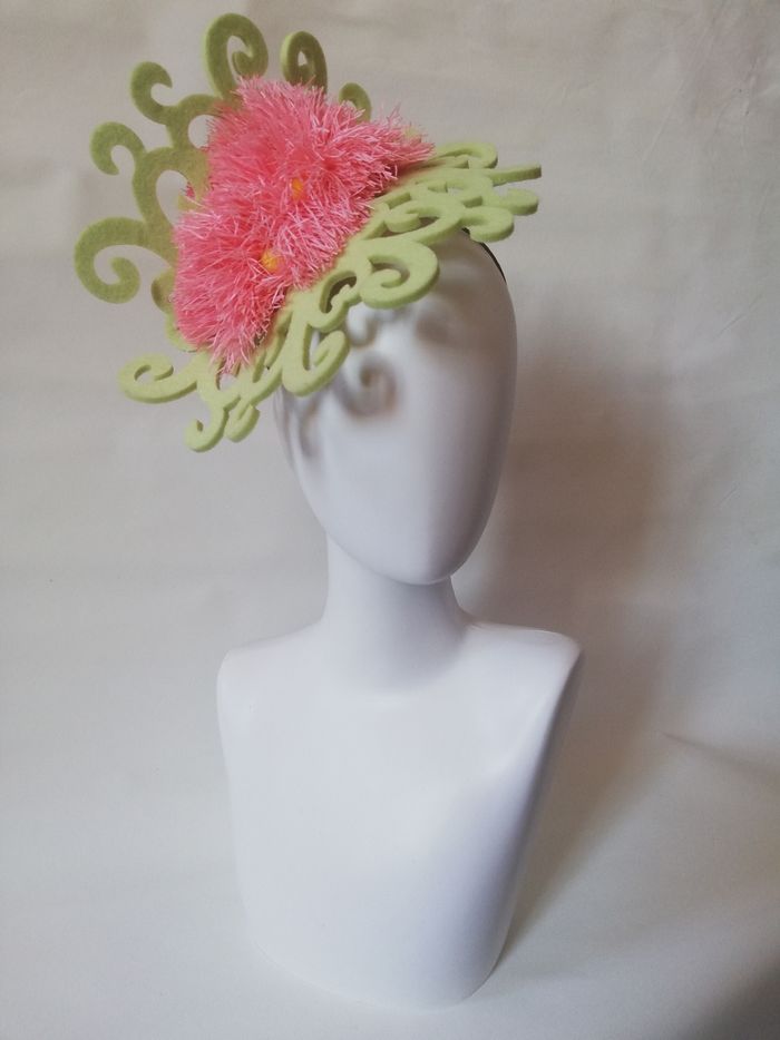 Chapeau pour un mariage, une cérémonie. Il est de couleur rose et vert, le maintien se fait avec un serre-tête. Original, avec un brin couture...