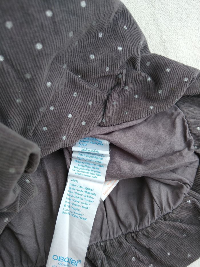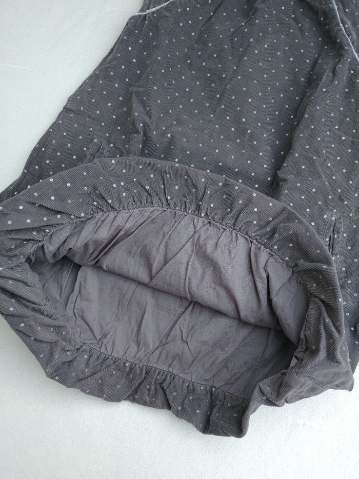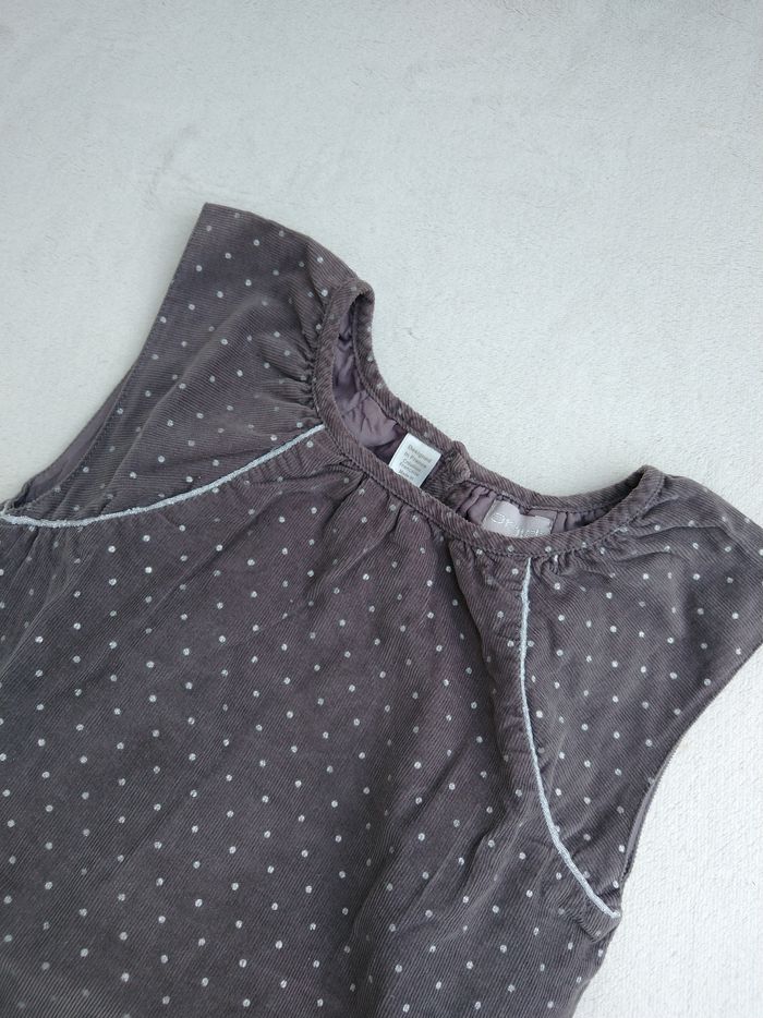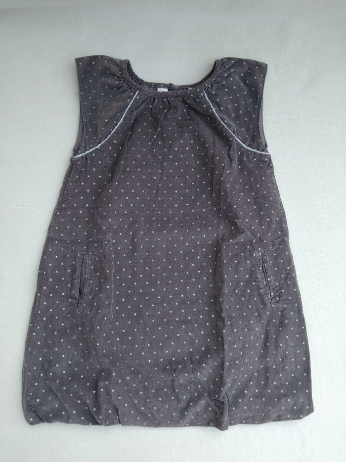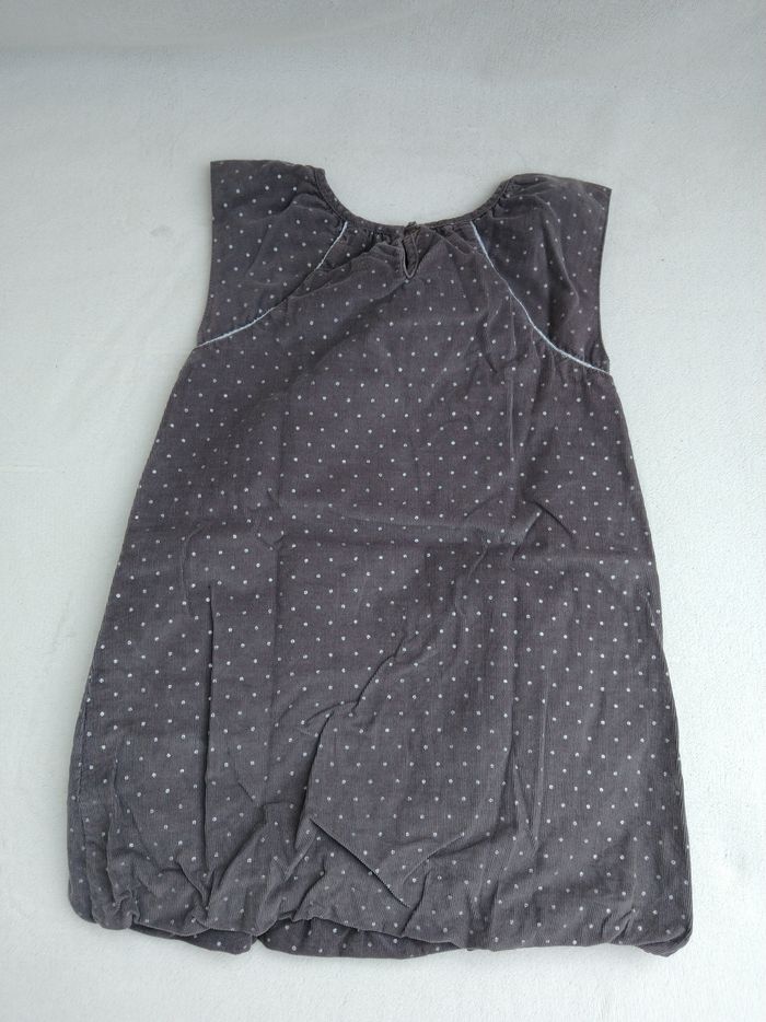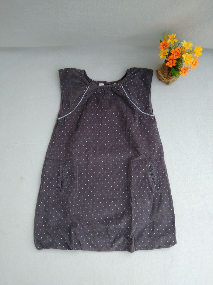 Robe sans manches Marque Okaïdi Taille 5 ans, 108 cm • Coloris marron, argenté • Motif pois • Goutte au dos • Bas de la robe effet ballon • 2 poches • Velours côtelé, doux Longueur totale : 55 cm En très bon état #evelyne_filles_5ans #evelyne_filles