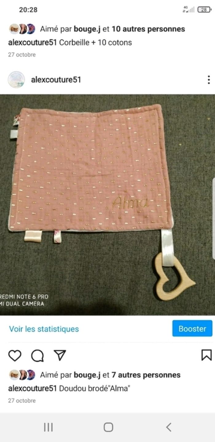 Doudou carré avec possibilit6de broder et de choisir le tissu Le petit plus, je met un petit anneau de dentition spécialement pour bébé