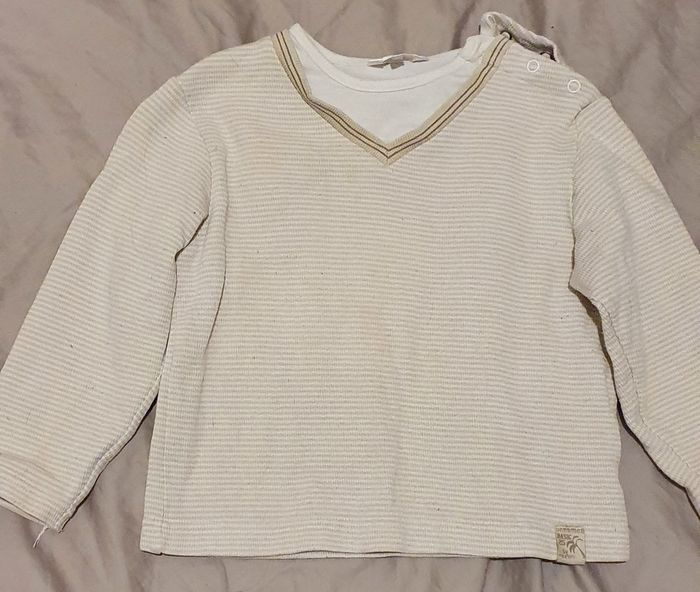 Tee-shirt kiabi beige crème manches longues. Un peu épais, et rêche. Peu se mettre en sweat également suivant les goûts. 4 ans