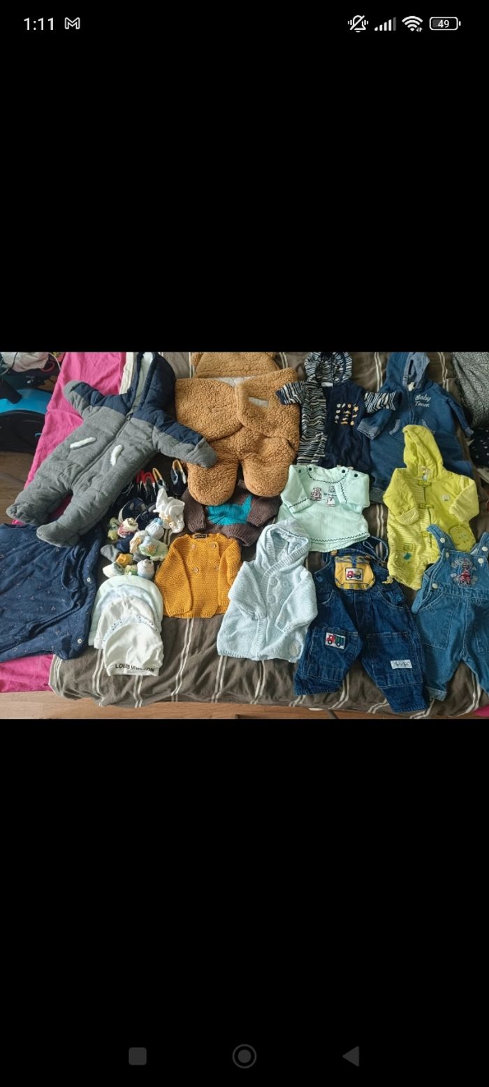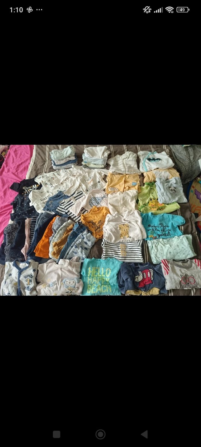 Un combi manteau Une couverture denmaillotage Une gigoteuse 16 pyjamas 13 pantalons 11 t-shirt 13 body Deux salopette 4 pull Deux combishort Un combi pantalon 5 bonnets 13 paires de chaussettes Une paire de chaussons 4 paires de chaussures sur l'une des paires il manque un lacet bleu foncé Au total 88 articles moins de 1 € par article