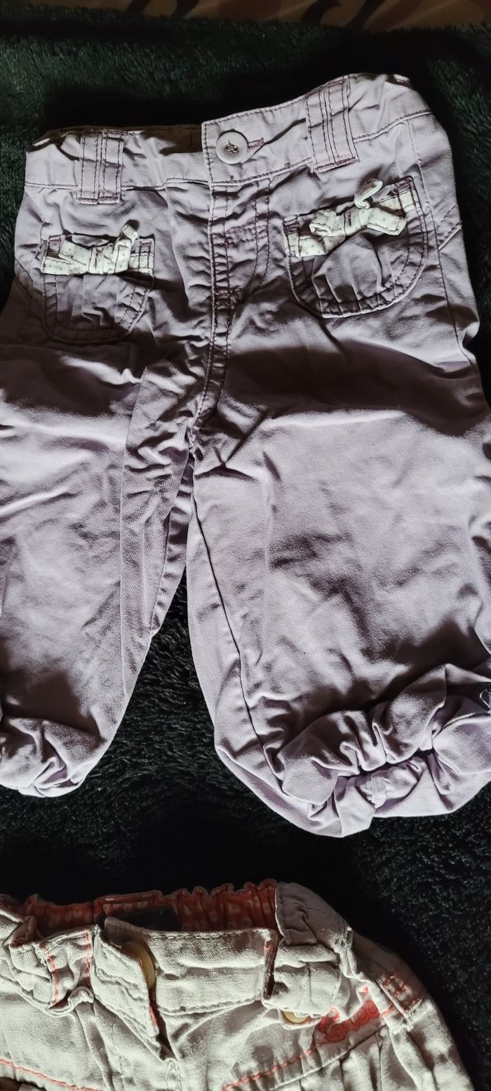Lot fille 6 mois - 1 combinaison sans pieds Sans marque ( rose ) bon état - 1 legging Chippie ( bleu ) bon état - 1 pantalon Tape à l'œil ( violet ) très bon état - 1 pantacourt Creeks ( beige ) bon état - 1 maillot Sans marque ( rose ) bon état - 1 robe en jean's Sergent major ( bleu et verte ) très bon état