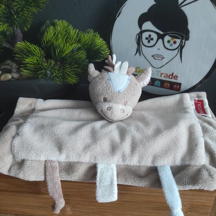 Doudou Plat Poney Cheval ane Beige Bleu Nattou Noa Croix #geektradedoudou
